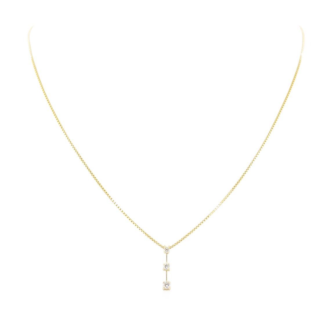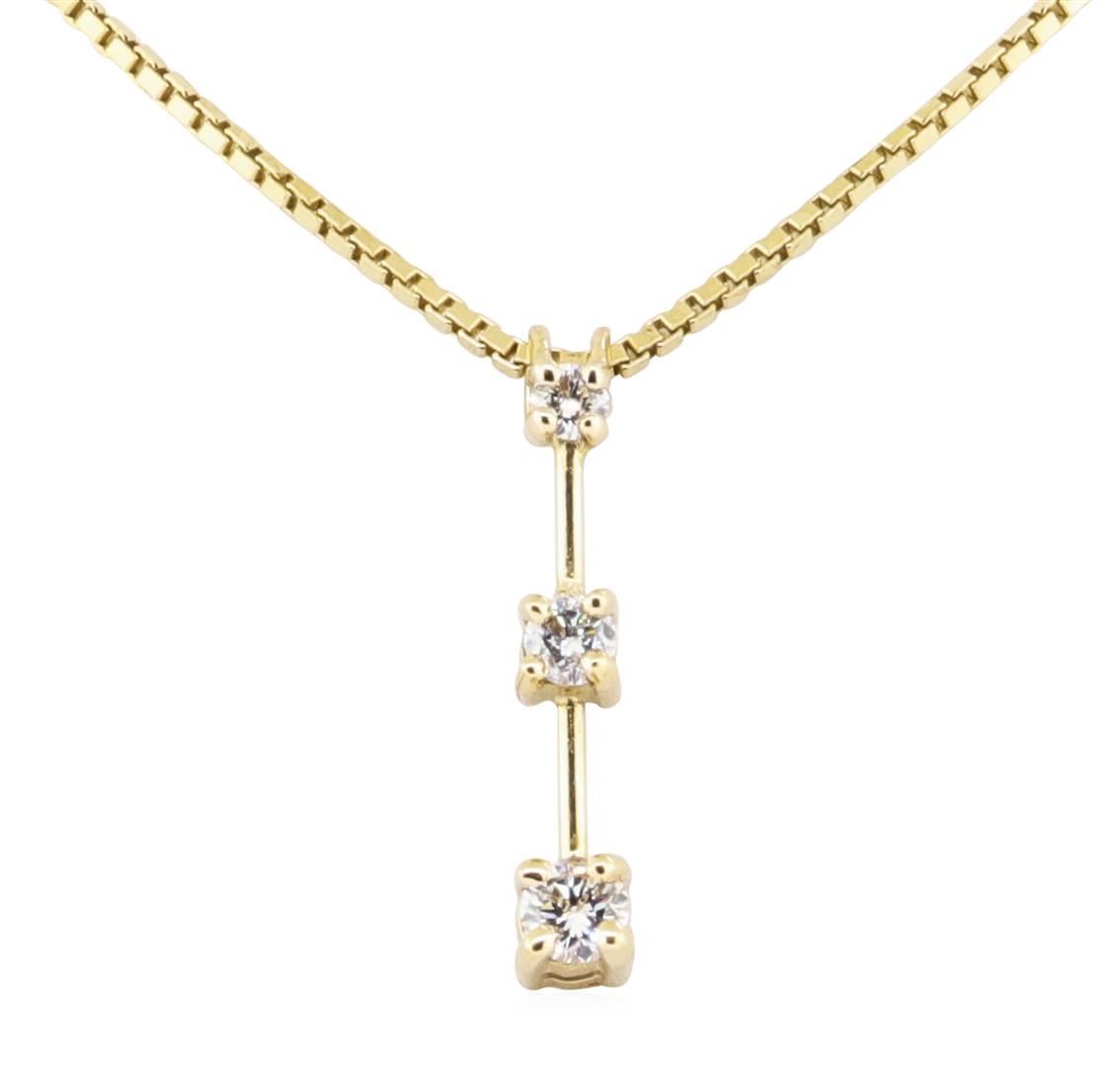 One Past, Present, Future diamond three stone pendant with an attached eighteen inch box link chain featuring: 14KT yellow gold weighing 4.0 grams containing diamonds weighing 0.25ctw.