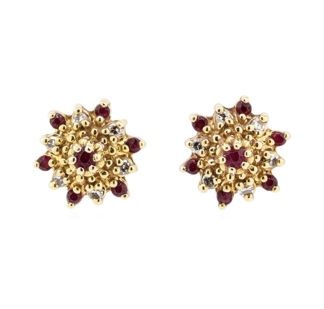 One pair of starburst design studs featuring: 14KT yellow gold weighing 2.5 grams containing rubies weighing 0.15ctw and diamonds weighing 0.10ctw.