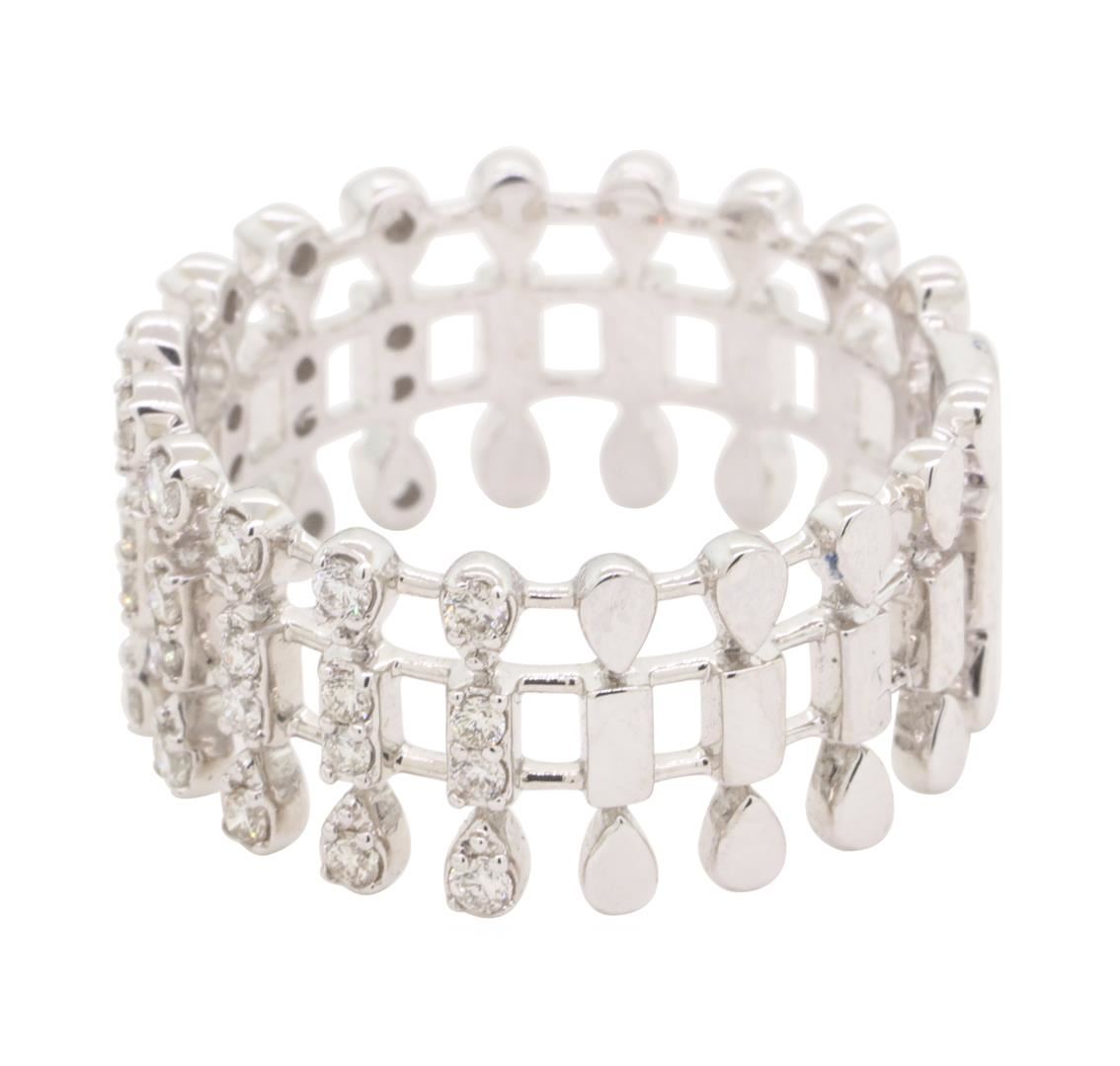 One electronically tested 14KT white gold lady's cast fashion ring with a three row wide band with a bright polish finish. This featured lady's ring has a shank measuring 9.32 millimeters in width. Identified with markings of '14K'. Condition is new, good workmanship. Containing: Eighteen prong set round brilliant cut diamonds, measuring 1.60 - 1.50 x 0.96mm (depth est.) approximate total weight of 18 Stones = 0.25ct. Graded in the setting. Color G - H Clarity VS-2 to SI-1 Cut Very Good Eighteen prong set round brilliant cut diamonds, measuring 1.40 - 1.35 x 0.86mm (depth est.) approximate total weight of 18 Stones = 0.20ct. Graded in the setting. Color G - H Clarity VS-2 to SI-1 Cut Very Good. Total Weight of Diamonds 0.45ct.. Total Weight of Ring 4.10gm GAS Appraised at $2065.00. GAS Appraised.