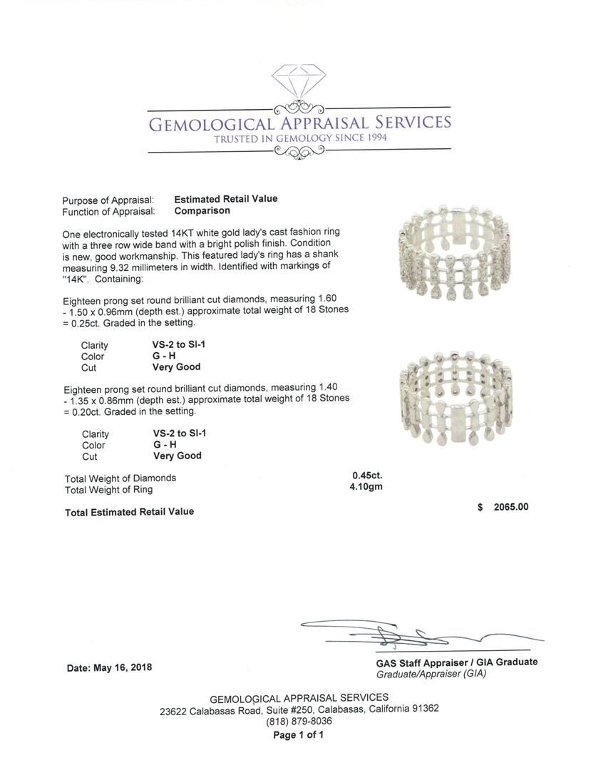 One electronically tested 14KT white gold lady's cast fashion ring with a three row wide band with a bright polish finish. This featured lady's ring has a shank measuring 9.32 millimeters in width. Identified with markings of '14K'. Condition is new, good workmanship. Containing: Eighteen prong set round brilliant cut diamonds, measuring 1.60 - 1.50 x 0.96mm (depth est.) approximate total weight of 18 Stones = 0.25ct. Graded in the setting. Color G - H Clarity VS-2 to SI-1 Cut Very Good Eighteen prong set round brilliant cut diamonds, measuring 1.40 - 1.35 x 0.86mm (depth est.) approximate total weight of 18 Stones = 0.20ct. Graded in the setting. Color G - H Clarity VS-2 to SI-1 Cut Very Good. Total Weight of Diamonds 0.45ct.. Total Weight of Ring 4.10gm GAS Appraised at $2065.00. GAS Appraised.