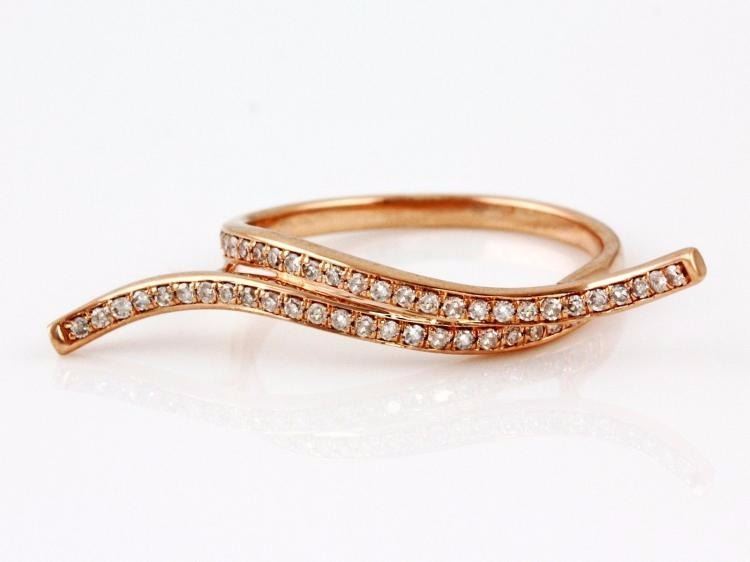 |**Total Carat Weight:0.25|**Clarity:Si2-Si3|**Cut:Verry Good|**Setting:Micro Pave Set|**Main Stone:|**MAIN Stone Treatment:Not Enhanced|**Main Stone Color:|**Main Stone Color:Round|**Theme:|**Length Inches:|**Ring Size:6.5|**Style:Band|**Metal Purity:14k|**Metal:Rose Gold|**Gold Weight:2.56g|**Dimension:|**Diamond Color:G-H|**Sizable:Yes|**Condition A brand-new, unused, and unworn item (including handmade items) in the original packaging (such as the original box or bag) and/or with the original tags attached|**Remarks: Colorless Diamonds, With no visible inclusions to the unaided eye. 0.25ct - 48pcs. - 0.8mm - Round Diamonds (Not Enhanced) SETTING: Micro Pave Set. BAND WIDTH: 1.7mm. RING HEIGHT: 1.7mm. BAR FACE DIMENSION: 32mm x 3.7mm. DESIGN: Overlap Curl Bar. WEIGHT OF GOLD: 2.56g 14K Solid Rose Gold - ("14K" Metal Stamp)