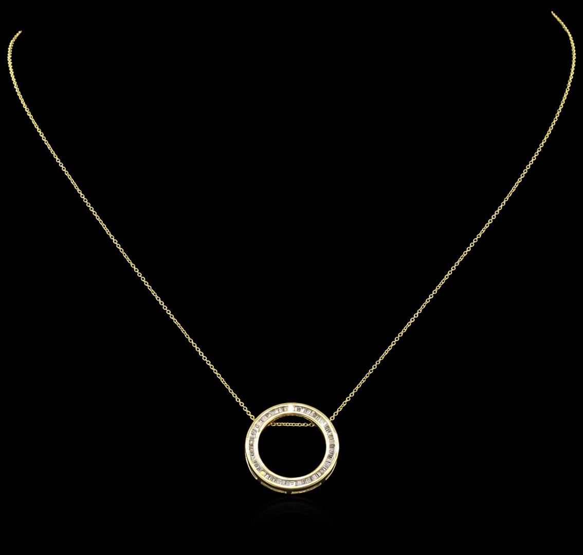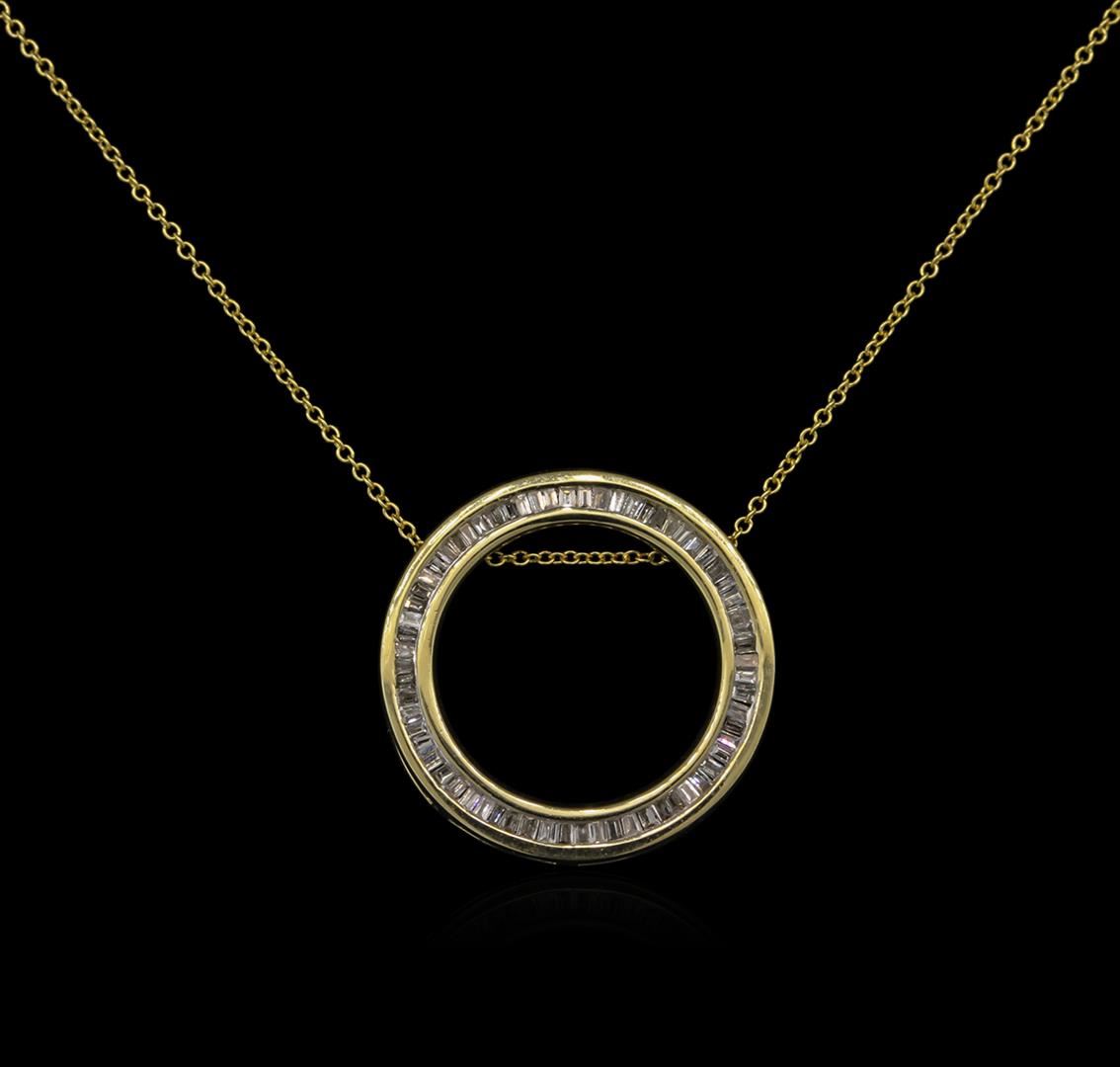 One circle pendant with chain featuring: 14KT yellow gold weighing 3.28 grams containing channel set baguette cut diamonds with a total weight of 0.25ct.