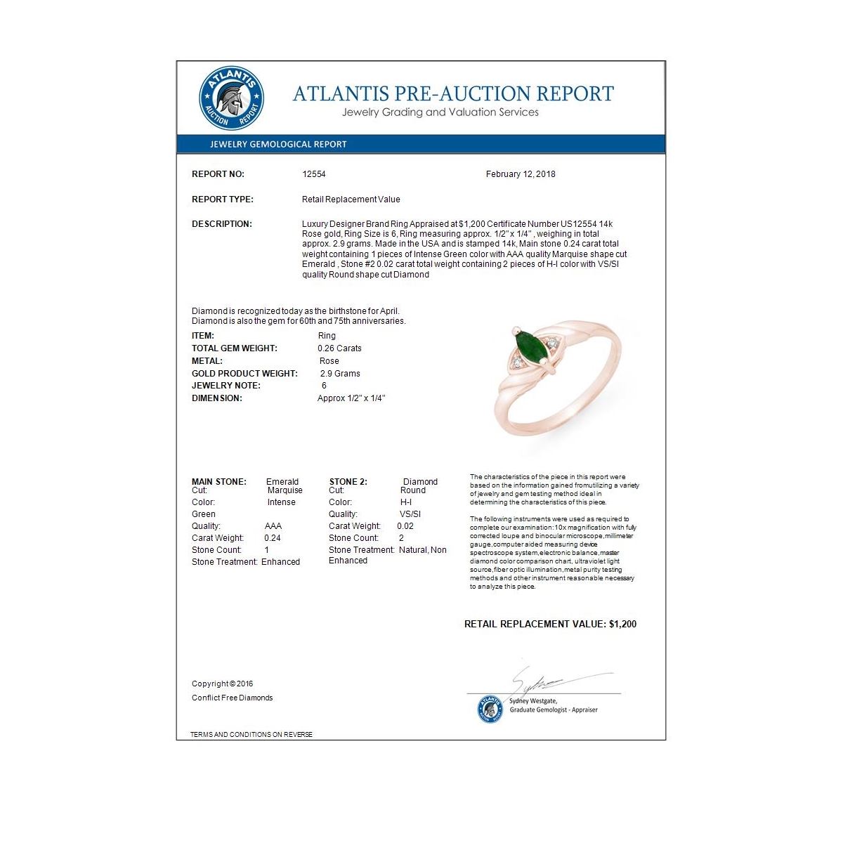 REF-18N2Y -12554 ---- 0.26 CTW Emerald & Diamond Ring 14K Rose Gold ---- Luxury Designer Brand Ring Appraised at $1,200 Certificate Number US12554 14k Rose gold, Ring Size is 6, Ring measuring approx. 1/2" x 1/4" , weighing in total approx. 2.9 grams. Made in the USA and is stamped 14k, Main stone 0.24 carat total weight containing 1 pieces of Intense Green color with AAA quality Marquise shape cut Emerald , Stone #2 0.02 carat total weight containing 2 pieces of H-I color with VS/SI quality Round shape cut Diamond
