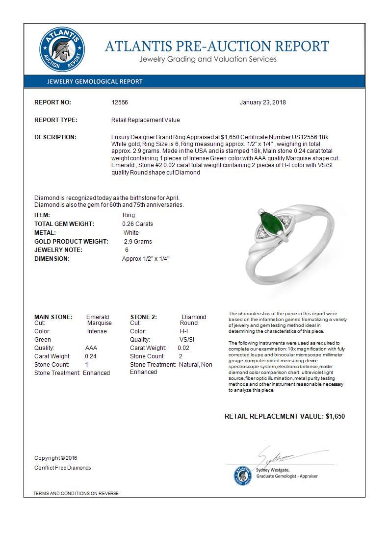REF-24M9H -12556 ---- 0.26 CTW Emerald & Diamond Ring 18K White Gold ---- Luxury Designer Brand Ring Appraised at $1,650 Certificate Number US12556 18k White gold, Ring Size is 6, Ring measuring approx. 1/2" x 1/4" , weighing in total approx. 2.9 grams. Made in the USA and is stamped 18k, Main stone 0.24 carat total weight containing 1 pieces of Intense Green color with AAA quality Marquise shape cut Emerald , Stone #2 0.02 carat total weight containing 2 pieces of H-I color with VS/SI quality Round shape cut Diamond
