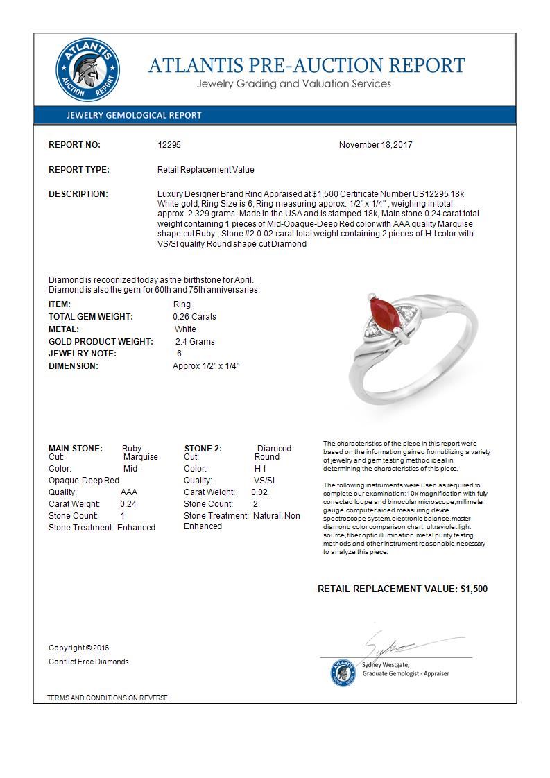 REF-22F8N -12295 ---- 0.26 CTW Ruby & Diamond Ring 18K White Gold ---- Luxury Designer Brand Ring Appraised at $1,500 Certificate Number US12295 18k White gold, Ring Size is 6, Ring measuring approx. 1/2" x 1/4" , weighing in total approx. 2.329 grams. Made in the USA and is stamped 18k, Main stone 0.24 carat total weight containing 1 pieces of Mid-Opaque-Deep Red color with AAA quality Marquise shape cut Ruby , Stone #2 0.02 carat total weight containing 2 pieces of H-I color with VS/SI quality Round shape cut Diamond