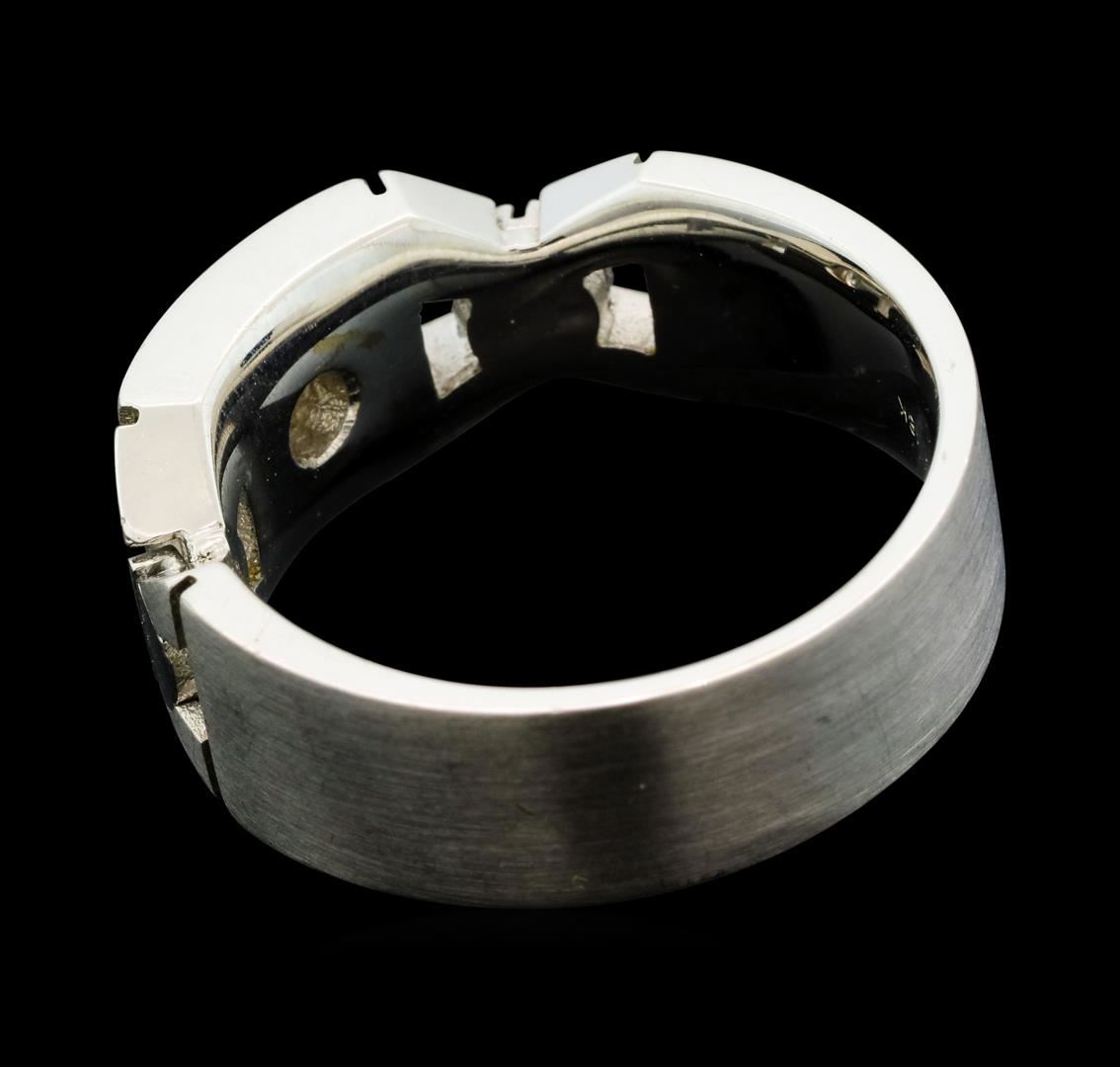 One electronically tested 18KT white gold man's cast wedding band with a bright polish and satin finish. The featured man's ring has a shank measuring 7.02 millimeters wide. Identified with markings of '18K'. Condition is new, good workmanship. Containing: One bezel set round brilliant cut diamond, measuring 4.15 - 4.10 x 2.50mm (depth est.) approximate weight of 0.26ct. Graded in the setting. Clarity I-1. Color: H - I Cut Good. Total Weight of Diamonds 0.26ct.. Total Weight of Band 16.90gm. GAS Appraised at $3,495.00.