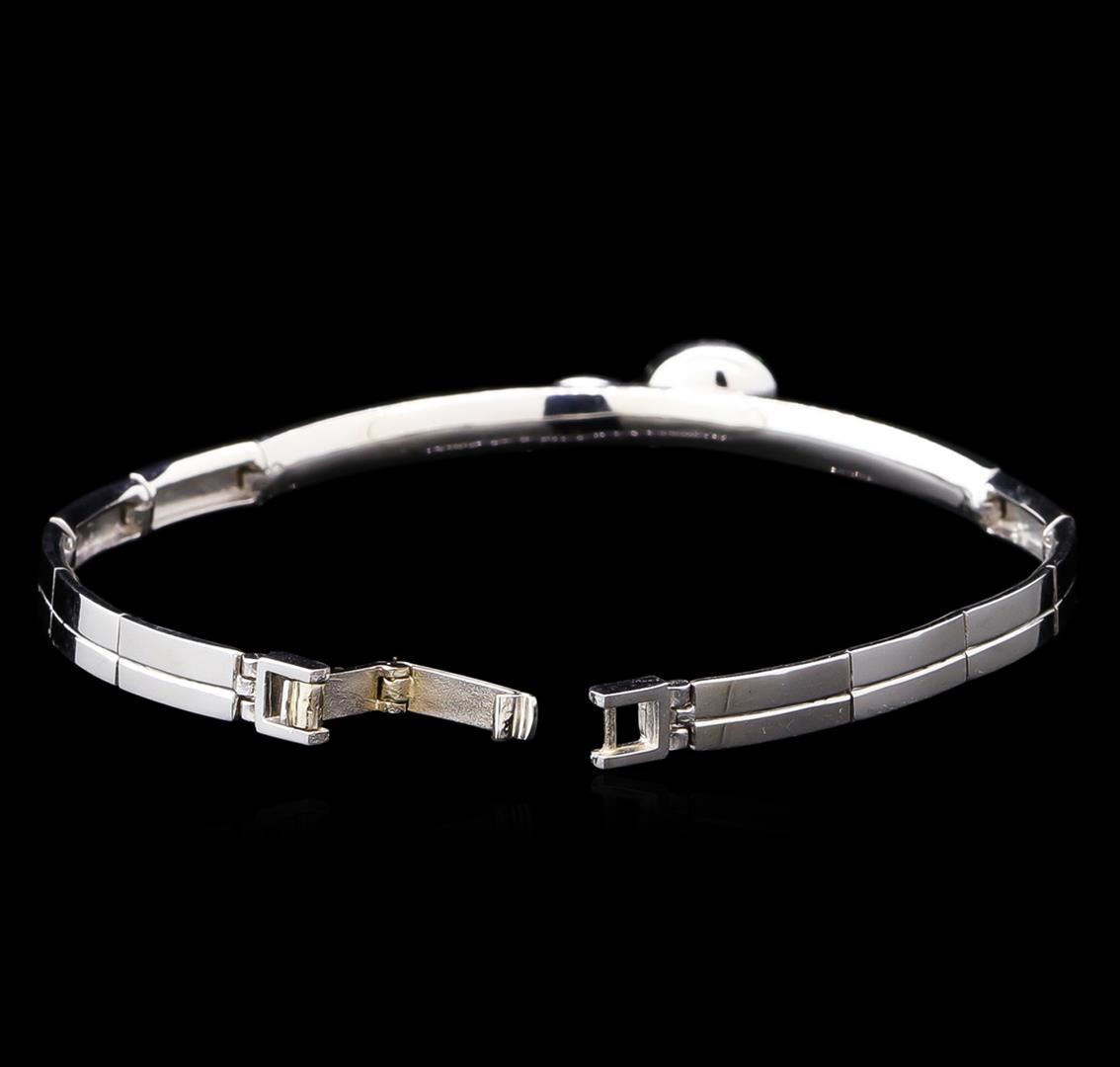One electronically tested 14KT white gold ladies cast & assembled diamond bracelet. Six and one-half inch wearable length bracelet features a raised diamond cluster and matching silver oval set on a rigid bar transitioning into white gold links, terminating in a snap lock clasp. Bright polish finish. Identified with markings of "585". Condition is new, good workmanship. Containing: Thirty-Four prong set round brilliant cut diamonds, measuring 1.30 - 1.20 x 0.75mm (depth est.) approximate total weight of 34 Stones = 0.26ct. Graded in the setting. Clarity: SI-2 to I-2. Color: G - I. Total Weight of Diamonds 0.26ct. Total Weight of Bracelet 10.59gm. AIG Appraised at $2,560.00.