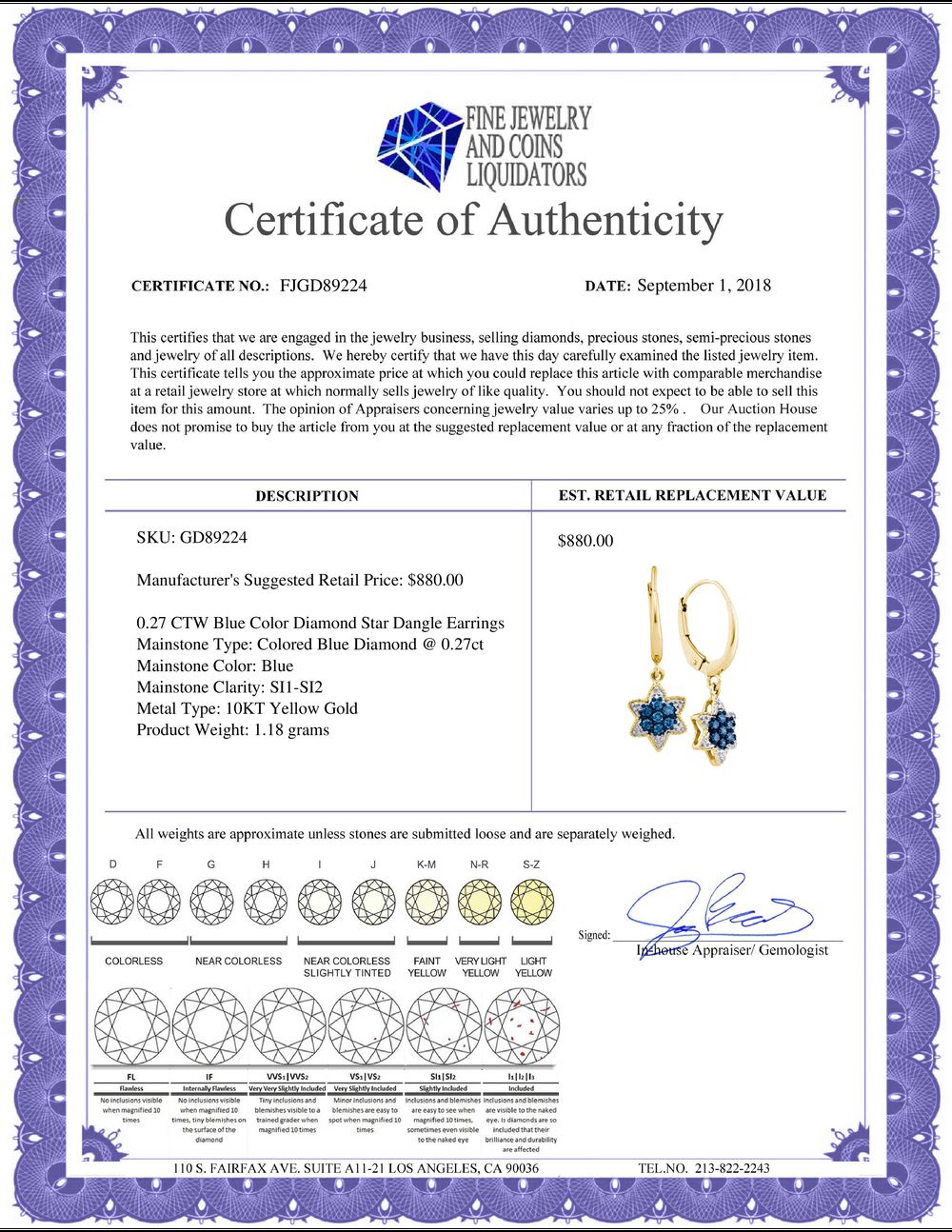 REF-22W4K- SKU: GD89224 ---- 0.27 CTW Blue Color Diamond Star Cluster Dangle Earrings 10KT Yellow Gold