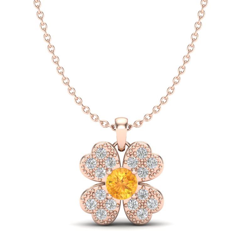 REF-21W3F -20355 ---- 0.27 CTW Citrine & Micro Pave VS/SI Diamond Necklace 14K Rose Gold ---- Luxury Designer Brand Necklace Appraised at $1,300 Certificate Number US20355 14k Rose gold, Necklace Size is 16 Inches, Necklace measuring approx. 3/8 " X 3/8 ", weighing in total approx. 2.4 grams. Made in the USA and is stamped 14k, Main stone 0.15 carat total weight containing 1 pieces of Translucent Yellow color with AAA quality Round shape cut Citrine , Stone #2 0.12 carat total weight containing 16 pieces of H-I color with VS/SI quality Round shape cut Diamond