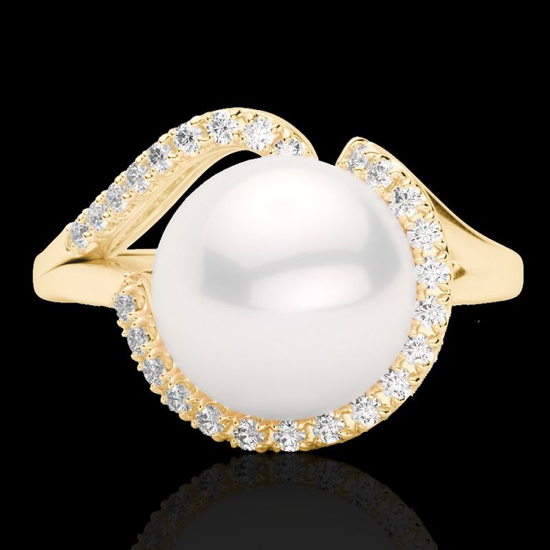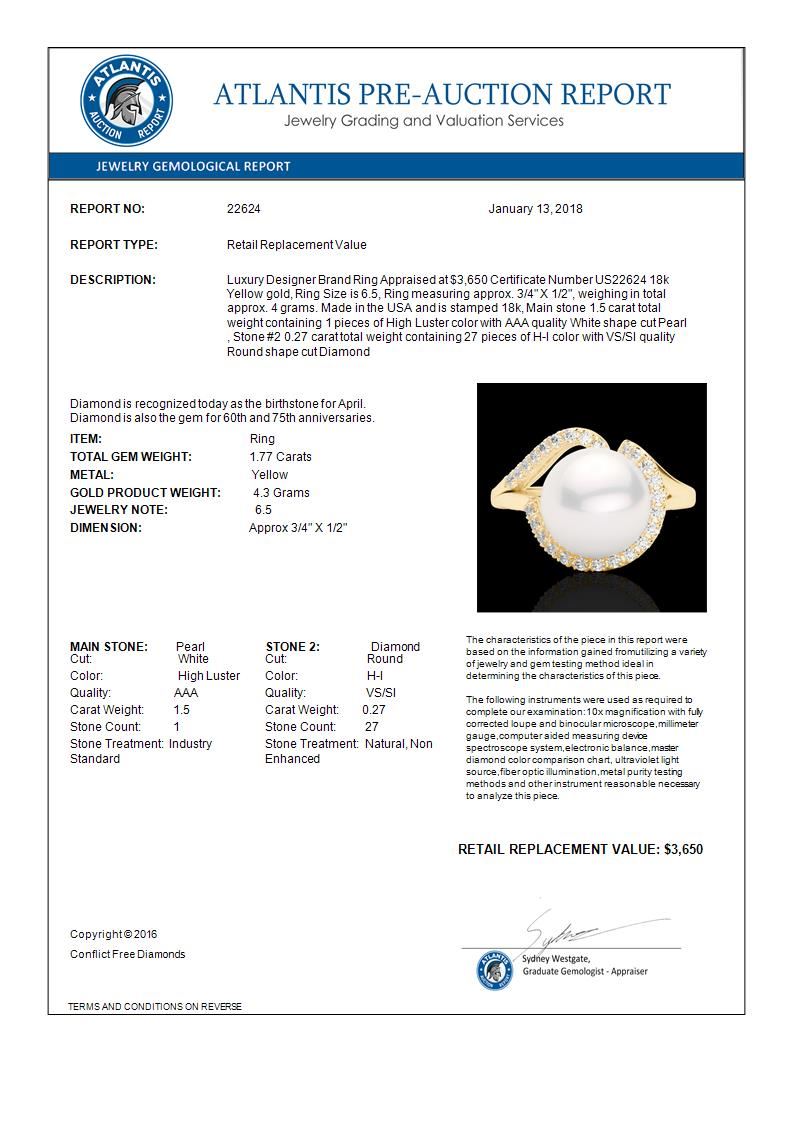REF-50N8Y -22624 ---- 0.27 CTW VS/SI Diamond & White Pearl Designer Ring 18K Yellow Gold ---- Luxury Designer Brand Ring Appraised at $3,650 Certificate Number US22624 18k Yellow gold, Ring Size is 6.5, Ring measuring approx. 3/4" X 1/2", weighing in total approx. 4 grams. Made in the USA and is stamped 18k, Main stone 1.5 carat total weight containing 1 pieces of High Luster color with AAA quality White shape cut Pearl , Stone #2 0.27 carat total weight containing 27 pieces of H-I color with VS/SI quality Round shape cut Diamond