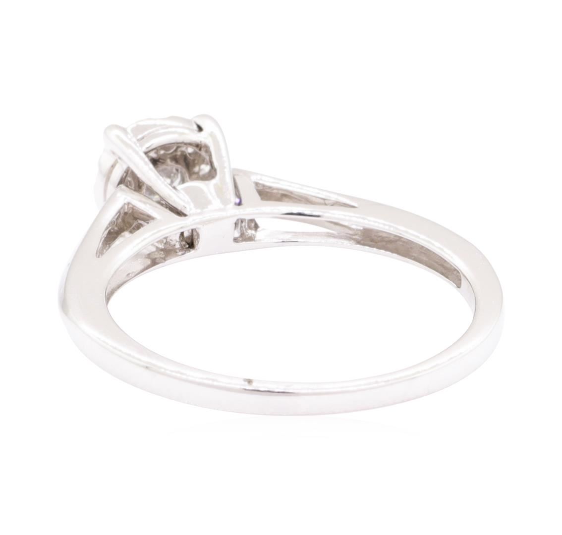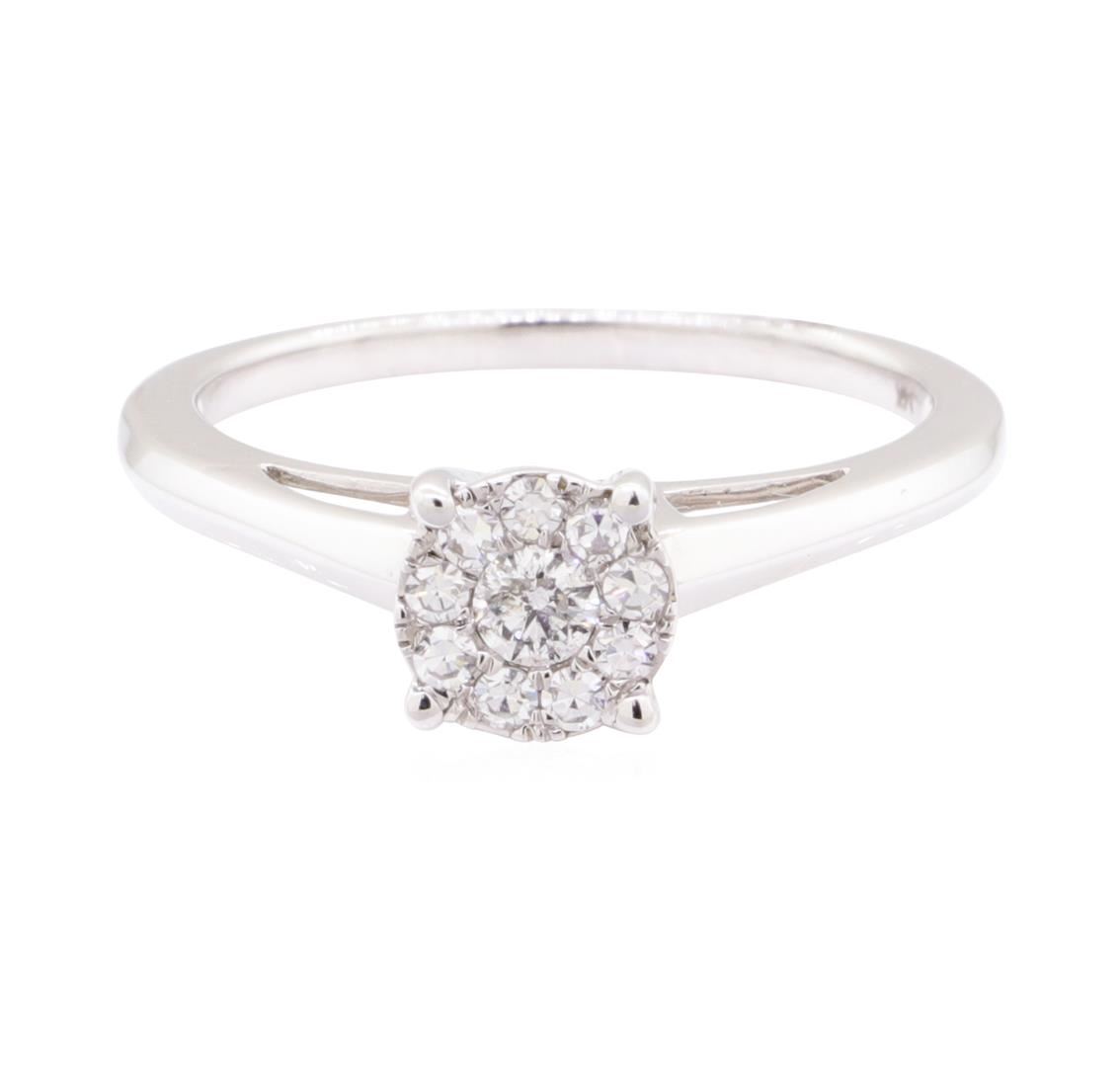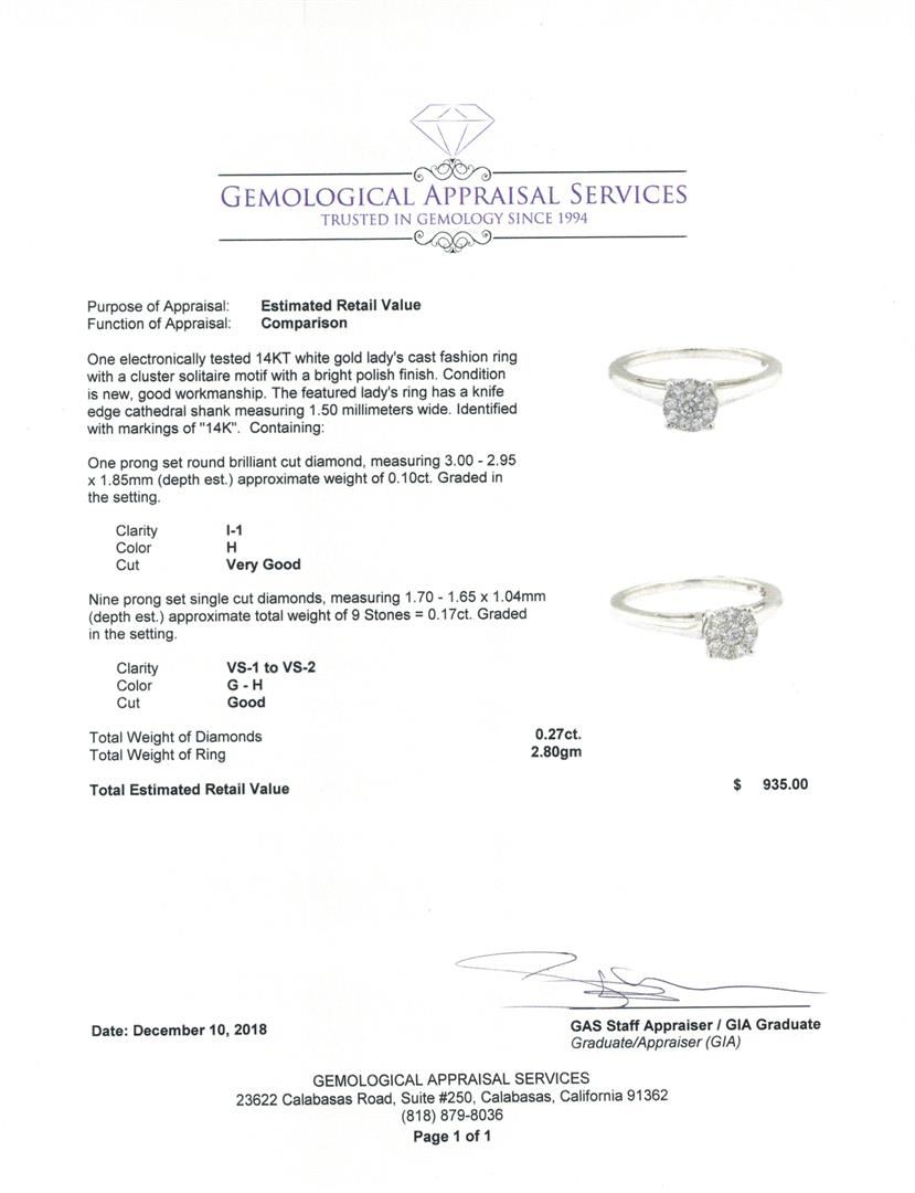 One electronically tested 14KT white gold lady's cast fashion ring with a cluster solitaire motif with a bright polish finish. The featured lady's ring has a knife edge cathedral shank measuring 1.50 millimeters wide. Identified with markings of '14K'. Condition is new, good workmanship. Containing: One prong set round brilliant cut diamond, measuring 3.00 - 2.95 x 1.85mm (depth est.) approximate weight of 0.10ct. Graded in the setting. Color H Clarity I-1 Cut Very Good Nine prong set single cut diamonds, measuring 1.70 - 1.65 x 1.04mm (depth est.) approximate total weight of 9 Stones = 0.17ct. Graded in the setting. Color G - H Clarity VS-1 to VS-2 Cut Good. Total Weight of Diamonds 0.27ct.. Total Weight of Ring 2.80gm GAS Appraised at $935.00. GAS Appraised.