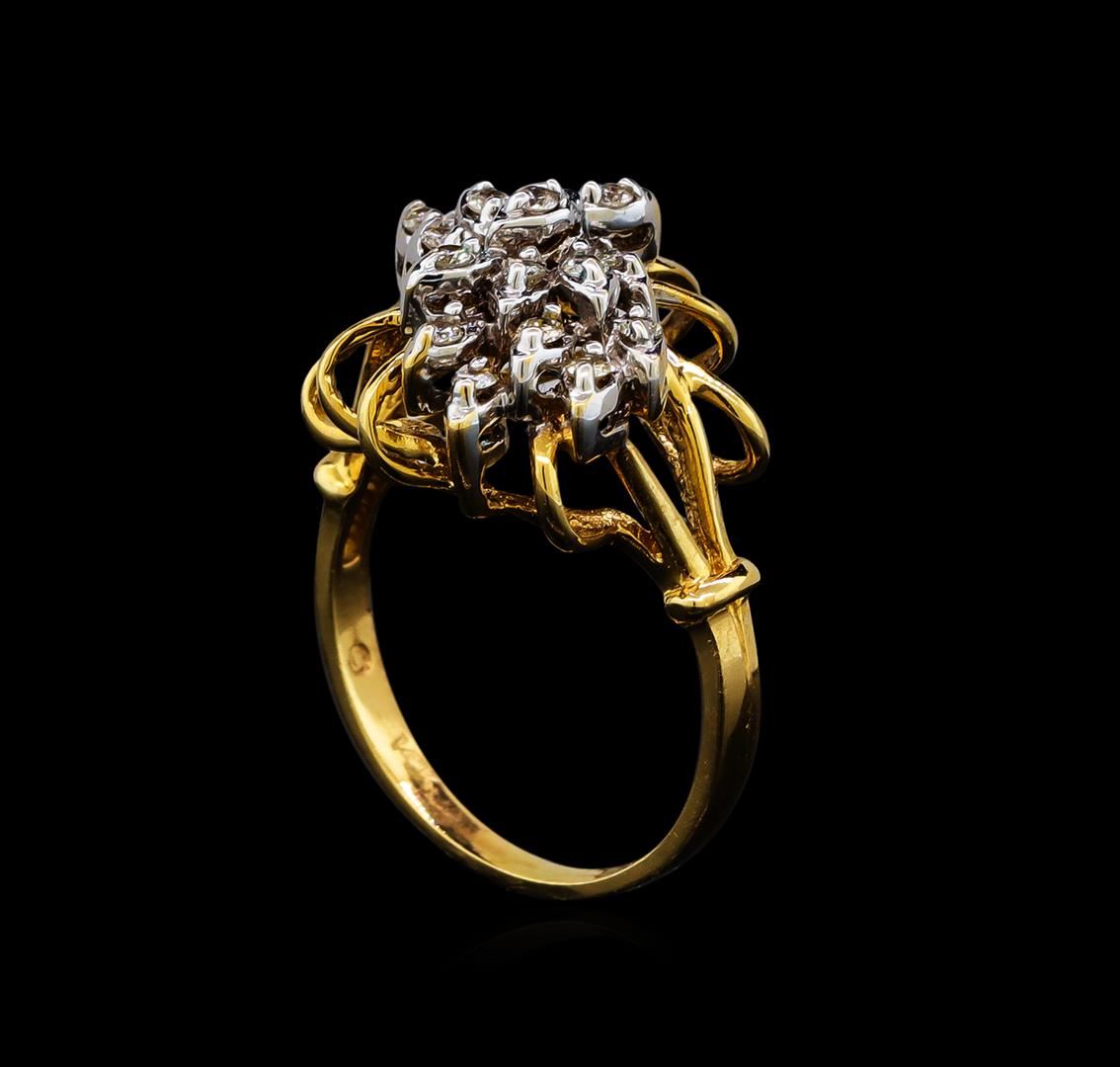 One electronically tested 14KT yellow and white gold lady's combination cast & assembled waterfall ring with a bright polish finish. The featured lady's ring has a shank measuring 1.87 millimeters wide. Identified with markings of '14K'. Condition is new, good workmanship. Containing: Nineteen prong set round brilliant cut diamonds, measuring 1.60 - 1.50 x 0.96mm (depth est.) approximate total weight of 19 Stones = 0.27ct. Graded in the setting. Clarity VS-2 to SI-2. Color: I - J Cut Good. Total Weight of Diamonds 0.27ct.. Total Weight of Ring 3.80gm. GAS Appraised at $1,370.00.