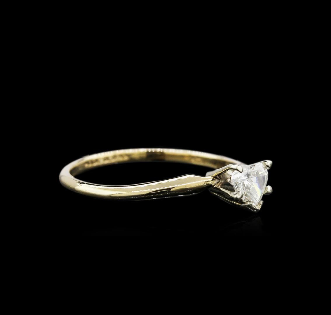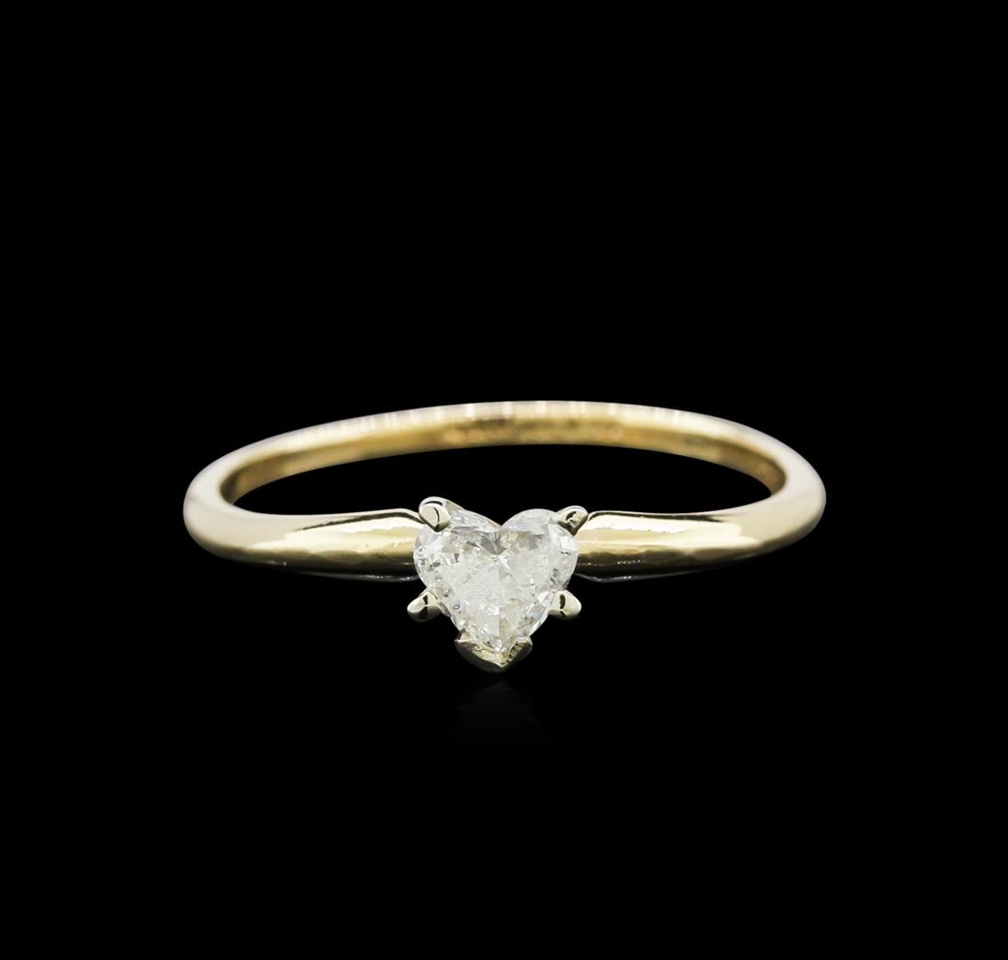 One electronically tested 14KT yellow gold lady's combination cast & assembled solitaire engagement ring with a bright polish finish. The featured lady's ring has a shank measuring 1.46 millimeters in width. Identified with markings of "14K". Condition is new, good workmanship. Containing: One prong set heart shaped cut diamond, measuring 4.20 x 4.70 x 2.35mm (depth est.) approximate weight of 0.27ct. Graded in the setting. Clarity: I-1. Color: I. Cut Good. Total Weight of Diamonds 0.27ct. Total Weight of Ring 1.70gm. GAS Appraised at $985.00.