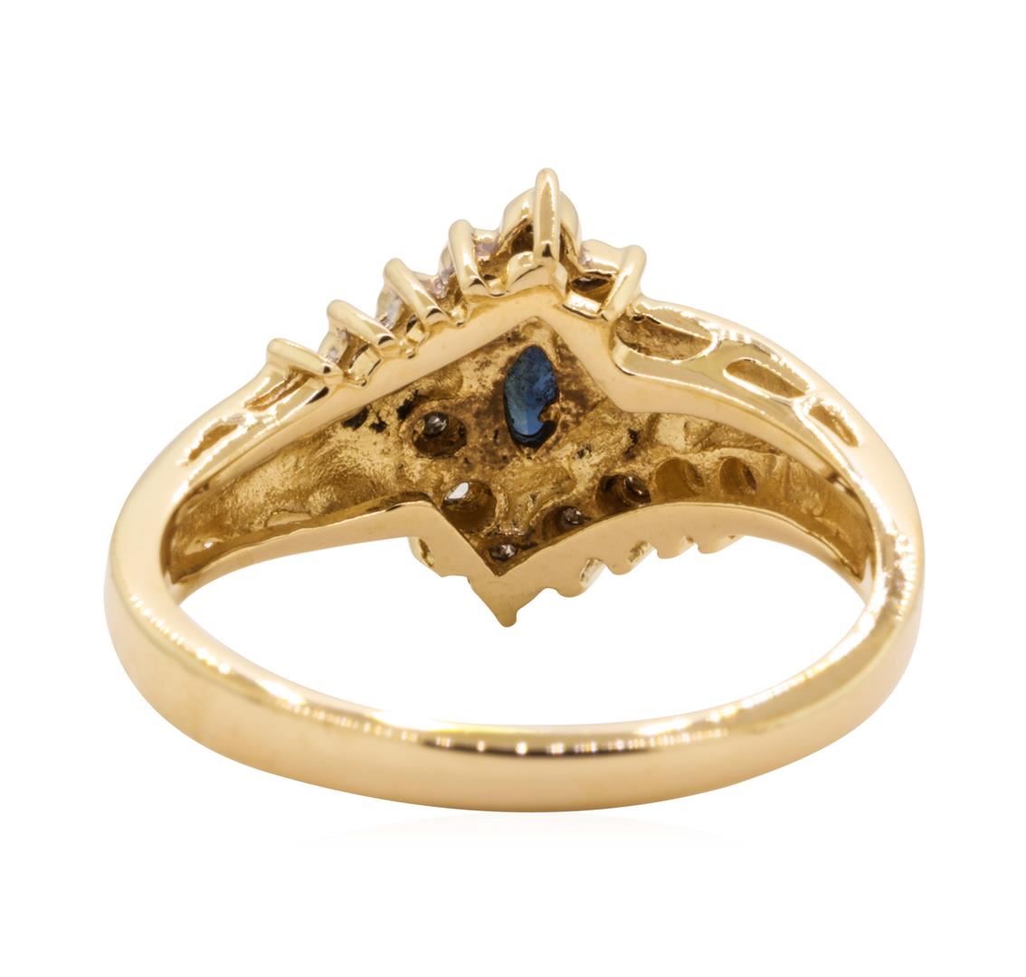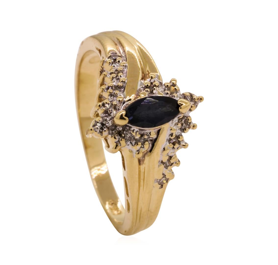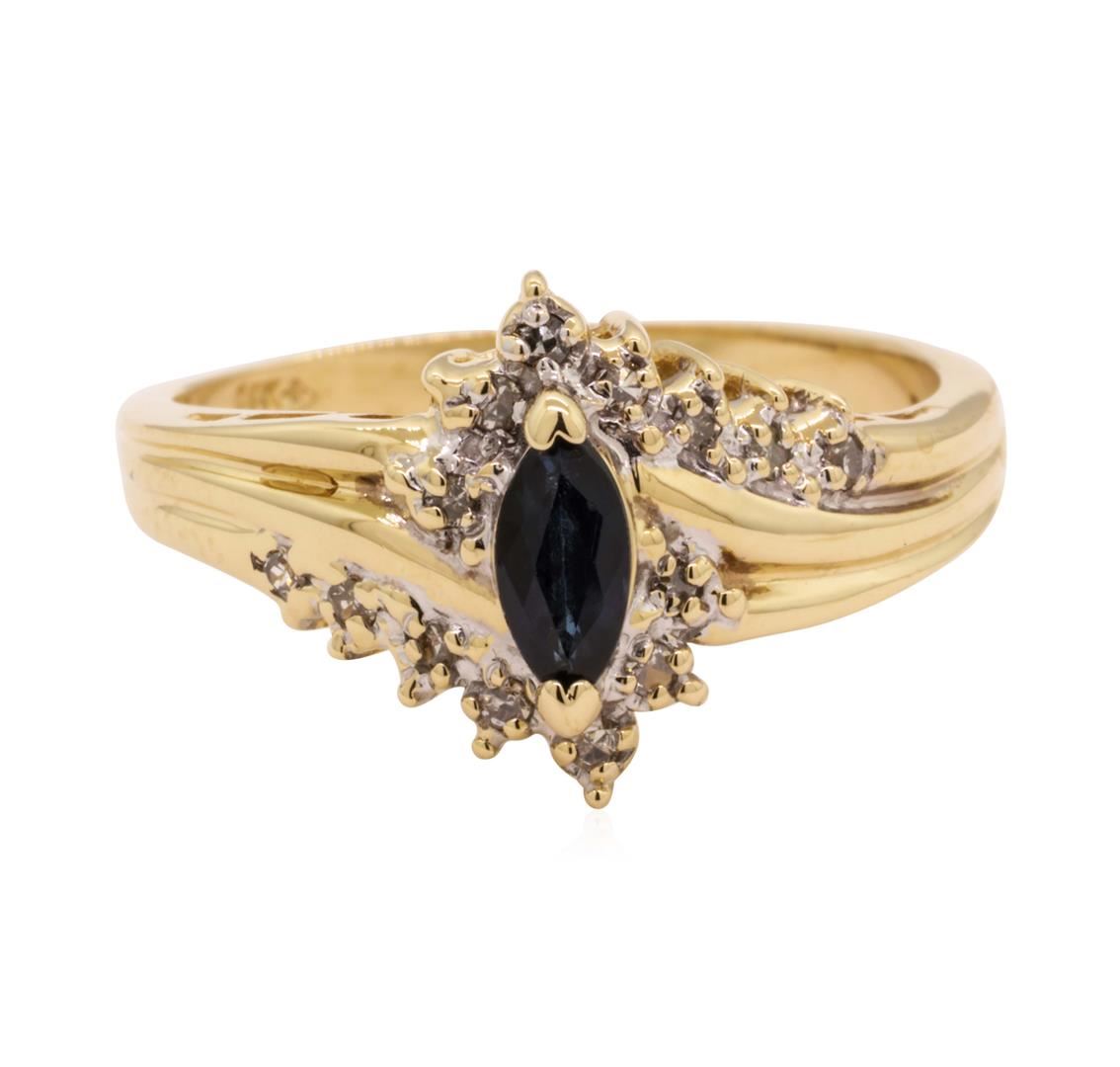 One lady's ring with a bypass motif featuring: 14KT yellow gold weighing 3.7 grams containing one sapphire weighing 0.20ct with diamonds weighing 0.07ctw.