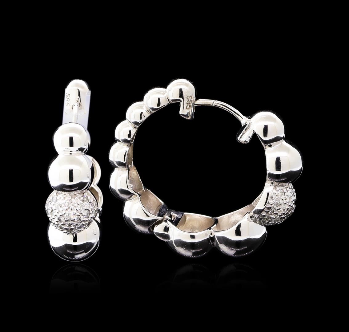 One pair electronically tested 14KT white gold ladies cast & assembled diamond hoop earrings with hinged, snap locking posts. Each earring features a graduating beaded hoop with diamond accents. Bright polish finish. Identified with markings of "585". Condition is new, good workmanship. Containing: Fifty-Four prong set round brilliant cut diamonds, measuring 1.20 - 1.00 x 0.66mm (depth est.) approximate total weight of 54 Stones = 0.28ct. Graded in the setting. Clarity: SI-2 to I-2. Color: G - I. Total Weight of Diamonds 0.28ct. Total Weight of Earrings 8.10gm. AIG Appraised.