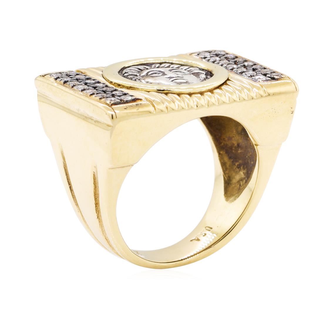 One lady's ring featuring: 18KT yellow gold weighing 16.0 grams containing one inset silver coin and diamonds weighing 0.28ctw.