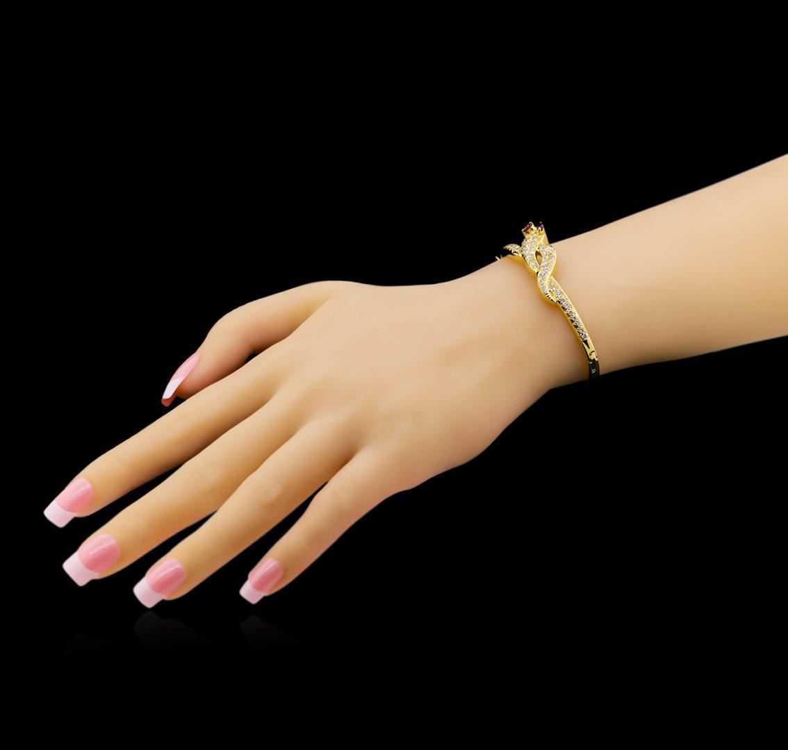 One electronically tested 18KT yellow gold ladies cast & assembled ruby and diamond bangle bracelet with a bright polish finish. Condition is new, good workmanship. Six inch wearable length bangle bracelet features a snake motif design. Two rubies accented the eyes of the snake. The head and body of the snake are encrusted with diamonds. The bangle bracelet is supported by hinged shoulders, terminating in a snap-locking clasp with safety. Bright polish finish. Identified with markings of "K18". Containing: Two prong set marquise mixed cut natural rubies, measuring 4.00 x 2.50 x 1.63mm, approximate total weight of 0.28ct., clarity is slightly included, type II, medium dark, very slightly brownish, slightly purplish red color, (GIA slpR 6/3), cut is good. Transmitting light with a minimum of distortion, transparent. Naturally occurring internal & external characteristics are present. Measurements & the color grade are an average for the pair. Graded in the setting. Forty-nine bead set round brilliant cut diamonds, measuring 1.70 - 1.50 x 0.96mm (depth est.) approximate total weight of 49 Stones = 0.83ct. Graded in the setting. Clarity: SI-2 to I-2. Color: F - H. Total Weight of Colored Stones: 0.28ct. Total Weight of Diamonds: 0.83ct. Total Weight of Bangle Bracelet 20.29 grams. AIG Appraised at $6,820.00.