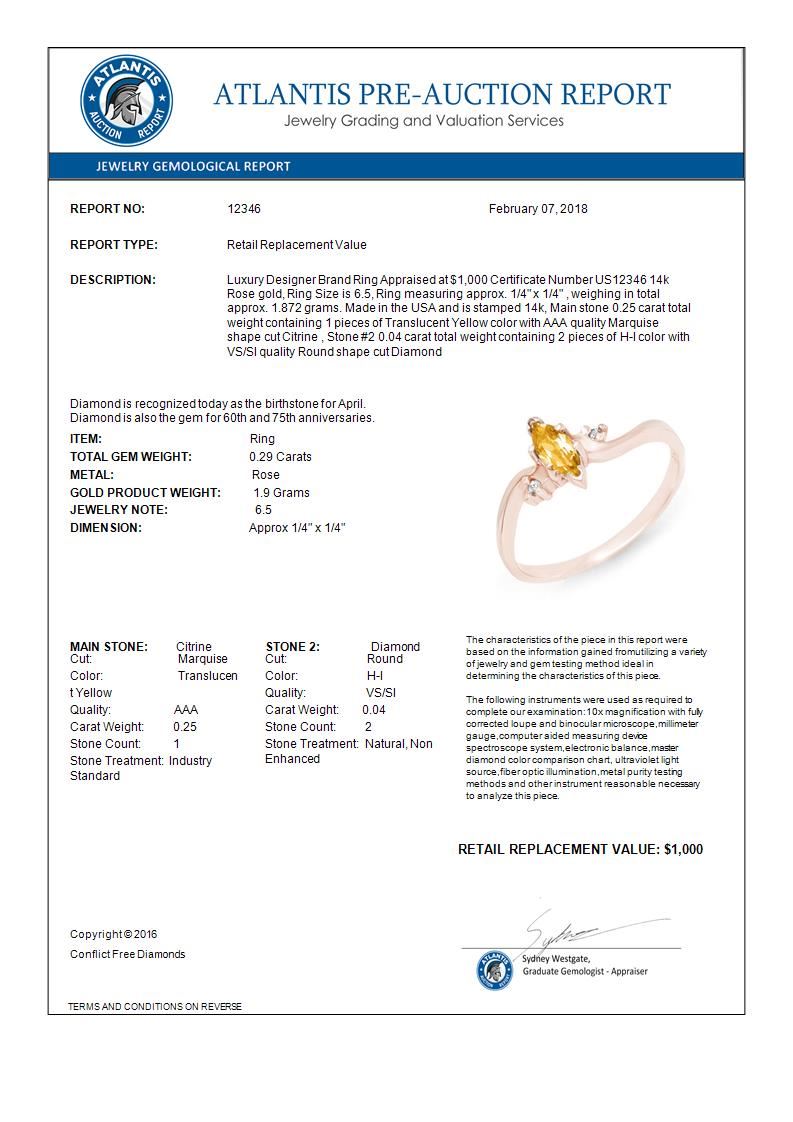 REF-16X9T -12346 ---- 0.29 CTW Citrine & Diamond Ring 14K Rose Gold ---- Luxury Designer Brand Ring Appraised at $1,000 Certificate Number US12346 14k Rose gold, Ring Size is 6.5, Ring measuring approx. 1/4" x 1/4" , weighing in total approx. 1.872 grams. Made in the USA and is stamped 14k, Main stone 0.25 carat total weight containing 1 pieces of Translucent Yellow color with AAA quality Marquise shape cut Citrine , Stone #2 0.04 carat total weight containing 2 pieces of H-I color with VS/SI quality Round shape cut Diamond