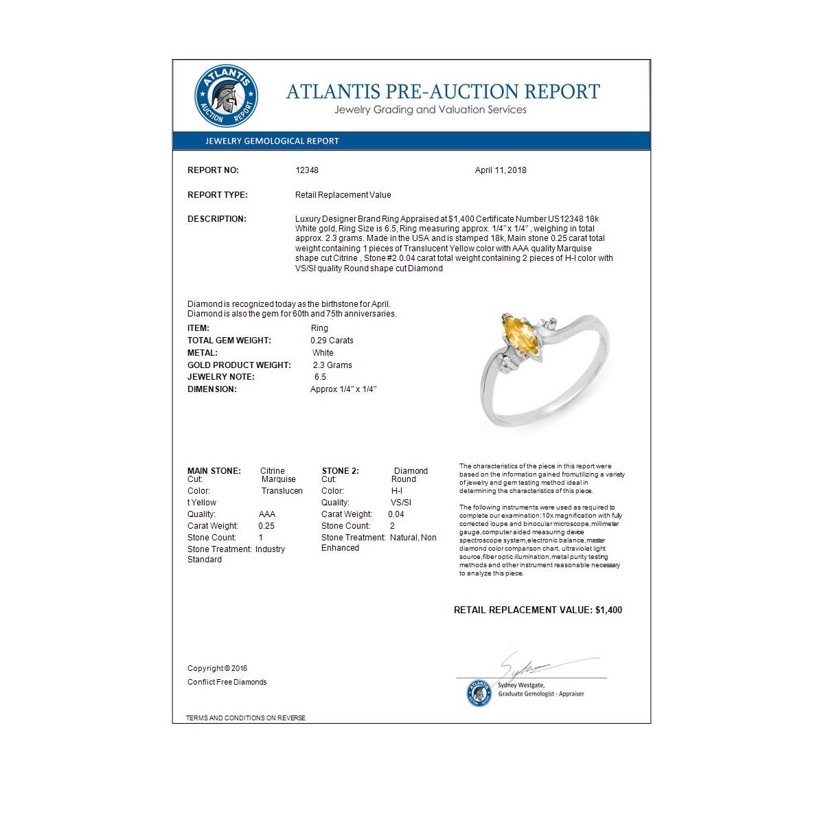 REF-22W9F -12348 ---- 0.29 CTW Citrine & Diamond Ring 18K White Gold ---- Luxury Designer Brand Ring Appraised at $1,400 Certificate Number US12348 18k White gold, Ring Size is 6.5, Ring measuring approx. 1/4" x 1/4" , weighing in total approx. 2.3 grams. Made in the USA and is stamped 18k, Main stone 0.25 carat total weight containing 1 pieces of Translucent Yellow color with AAA quality Marquise shape cut Citrine , Stone #2 0.04 carat total weight containing 2 pieces of H-I color with VS/SI quality Round shape cut Diamond