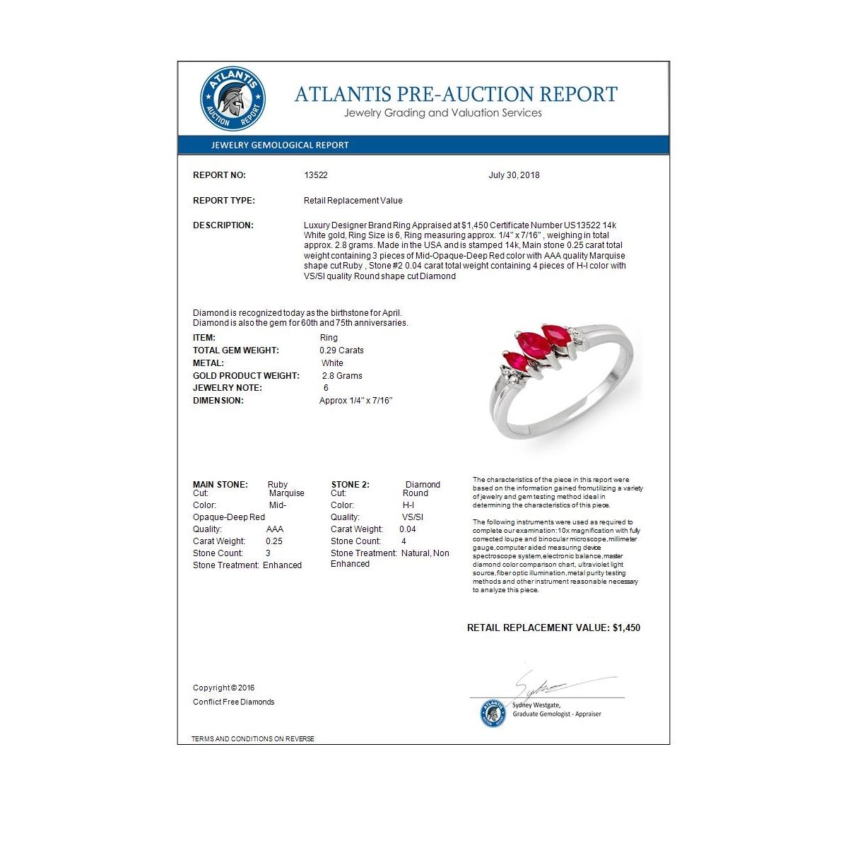 REF-21A8X -13522 ---- 0.29 CTW Ruby & Diamond Ring 14K White Gold ---- Luxury Designer Brand Ring Appraised at $1,450 Certificate Number US13522 14k White gold, Ring Size is 6, Ring measuring approx. 1/4" x 7/16" , weighing in total approx. 2.8 grams. Made in the USA and is stamped 14k, Main stone 0.25 carat total weight containing 3 pieces of Mid-Opaque-Deep Red color with AAA quality Marquise shape cut Ruby , Stone #2 0.04 carat total weight containing 4 pieces of H-I color with VS/SI quality Round shape cut Diamond