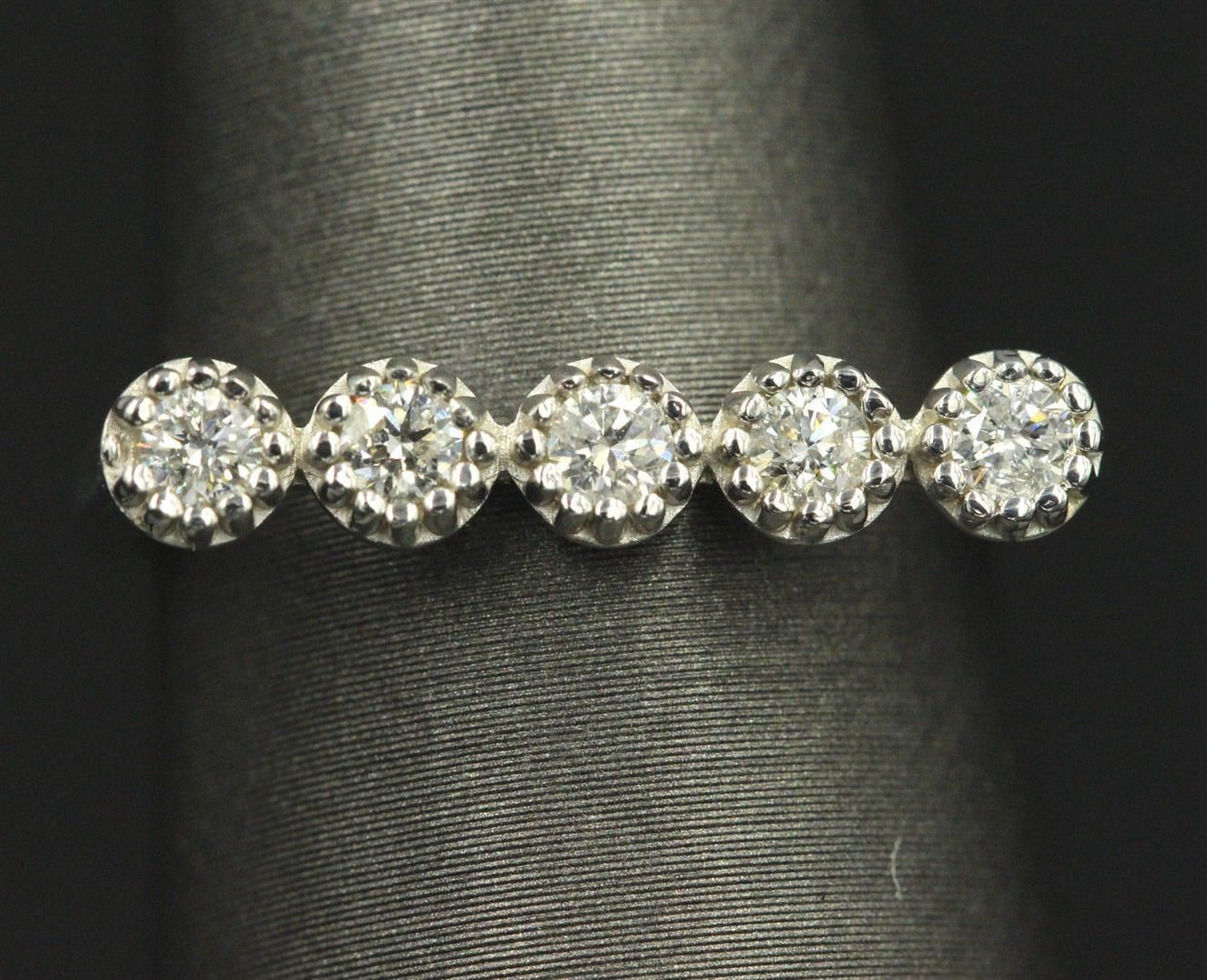 One lady's ring featuring: 14KT white gold weighing 2.33 grams containing five diamonds weighing 0.29ctw. The diamonds are round brilliant cut with G-H color and SI1-SI2 clarity. The ring is a size 6.25 but can be resized.