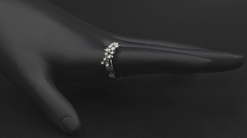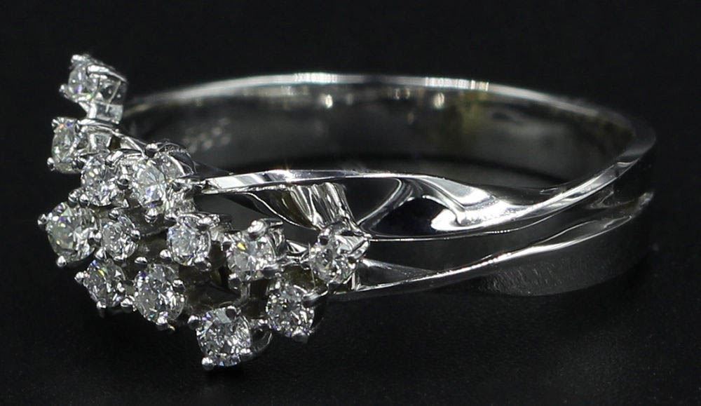 One lady's cluster ring featuring: 14KT white gold weighing 2.53 grams containing 13 diamonds weighing 0.30ctw. The diamonds are round brilliant cut with SI1-SI2 clarity and G color. The ring is a size 6.25 but can be resized.