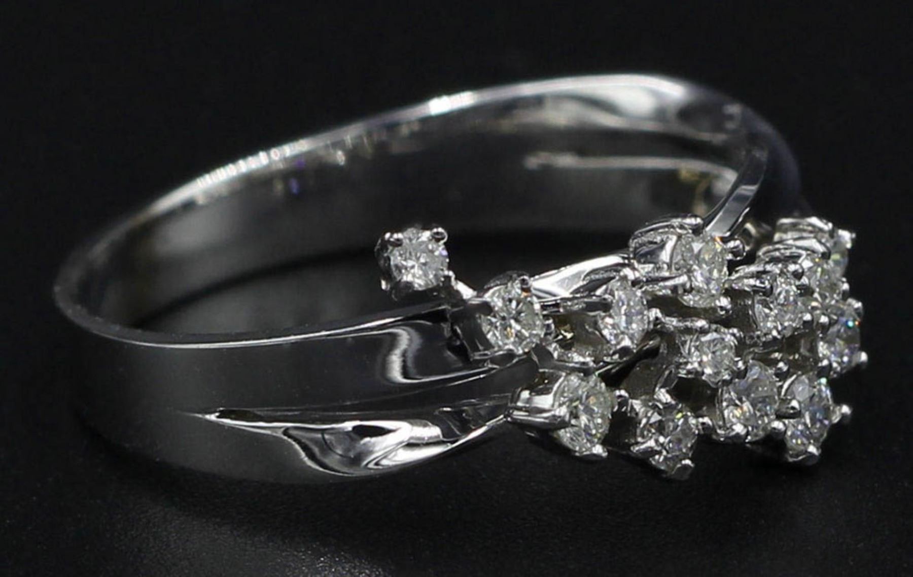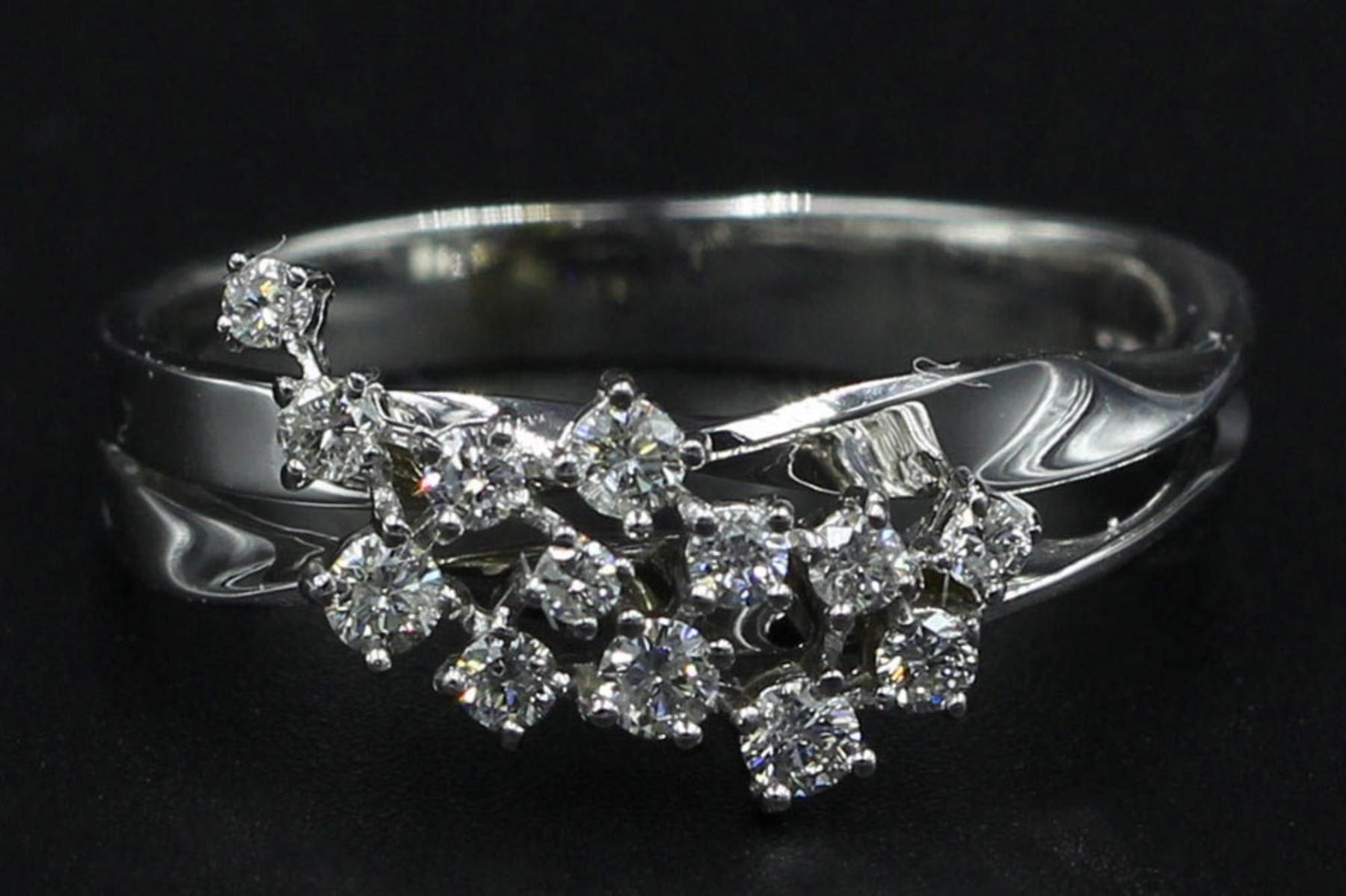 One lady's cluster ring featuring: 14KT white gold weighing 2.53 grams containing 13 diamonds weighing 0.30ctw. The diamonds are round brilliant cut with SI1-SI2 clarity and G color. The ring is a size 6.25 but can be resized.