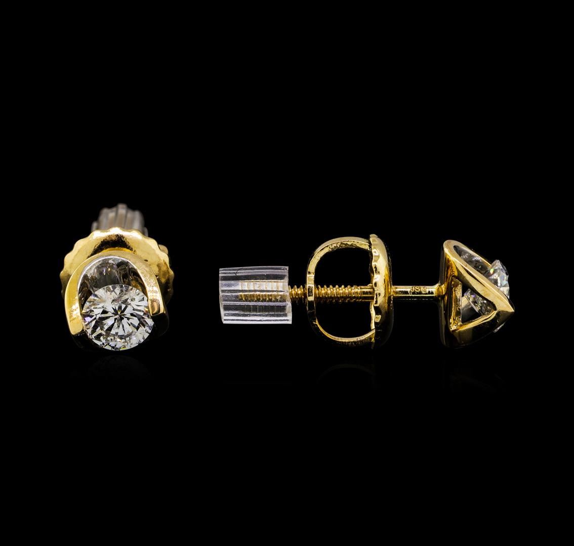 One pair electronically tested 14KT yellow gold lady's combination cast & assembled fashion stud earrings with threaded posts and screw-on/screw-off backs with a bright polish finish. Identified with markings of '14K'. Condition is new, good workmanship. Containing: Two channel set round brilliant cut diamonds, measuring 3.42 - 3.38 x 2.11mm (depth est.) approximate total weight of 2 Stones = 0.30ct. The featured diamonds are Canadian in origin. Graded in the setting in the GGI Laboratory, report numbers CID0742B1149792 and CID0742B1149793. Color F Clarity SI-2 to I-1 Cut Good. Total Weight of Diamonds 0.30ct.. Total Weight of Earrings 0.90gm GAS Appraised at $995.00. GAS Appraised at $995.00.