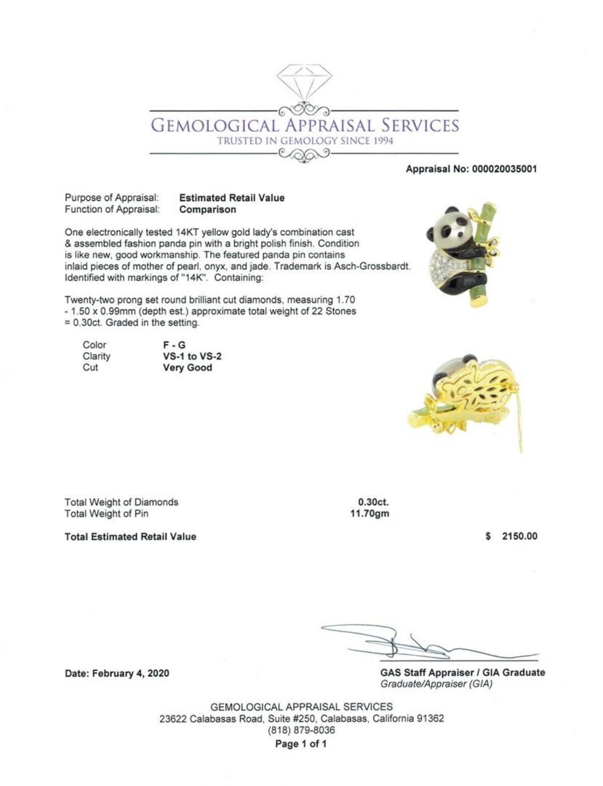 One electronically tested 14KT yellow gold lady's combination cast & assembled fashion panda pin with a bright polish finish. The featured panda pin contains inlaid pieces of mother of pearl, onyx, and jade. Trademark is Asch-Grossbardt. Identified with markings of '14K'. Condition is like new, good workmanship. Containing: Twenty-Two prong set round brilliant cut diamonds, measuring 1.70 - 1.50 x 0.99mm (depth est.) approximate total weight of 22 Stones = 0.30ct. Graded in the setting. Color F - G Clarity VS-1 to VS-2 Cut Very Good. Total Weight of Diamonds 0.30ct.. Total Weight of Pin 11.70gm GAS Appraised at $2150.00. GAS Appraised at $2,150.00.