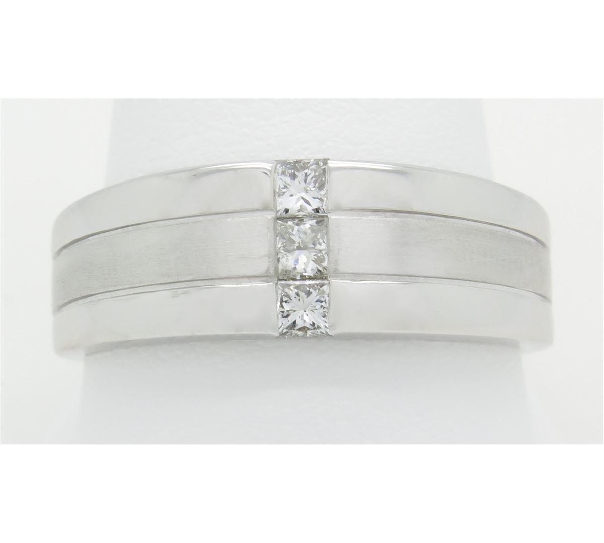 One tested 14K white gold mens diamond ring. Containing: 3 Princess Cut Diamonds. Clarity: I-SI, Color: G-H. Approximate total diamond weight: .30CTW. Diamonds are graded in the mounting, unless otherwise stated. Weight of ring: 6.2 grams. Size: 10.