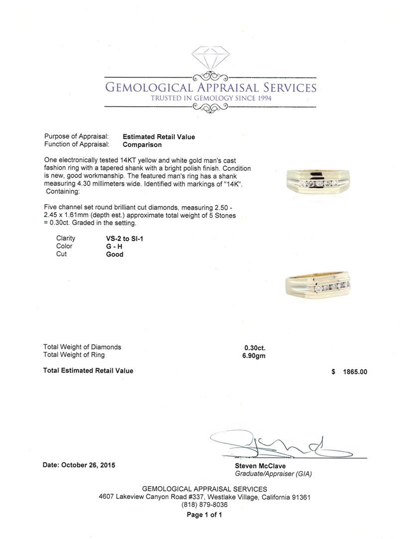 One electronically tested 14KT yellow and white gold man's cast fashion ring with a tapered shank with a bright polish finish. The featured man's ring has a shank measuring 4.30 millimeters wide. Identified with markings of "14K". Condition is new, good workmanship. Containing: Five channel set round brilliant cut diamonds, measuring 2.50 - 2.45 x 1.61mm (depth est.) approximate total weight of 5 Stones = 0.30ct. Graded in the setting. Clarity: VS-2 to SI-1. Color: G - H. Cut Good. Total Weight of Diamonds 0.30ct. Total Weight of Ring 6.90gm. GAS Appraised at $1,865.00.
