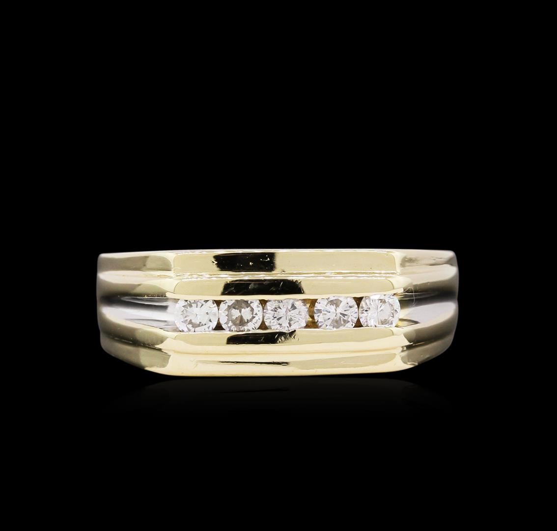 One electronically tested 14KT yellow and white gold man's cast fashion ring with a tapered shank with a bright polish finish. The featured man's ring has a shank measuring 4.30 millimeters wide. Identified with markings of "14K". Condition is new, good workmanship. Containing: Five channel set round brilliant cut diamonds, measuring 2.50 - 2.45 x 1.61mm (depth est.) approximate total weight of 5 Stones = 0.30ct. Graded in the setting. Clarity: VS-2 to SI-1. Color: G - H. Cut Good. Total Weight of Diamonds 0.30ct. Total Weight of Ring 6.90gm. GAS Appraised at $1,865.00.