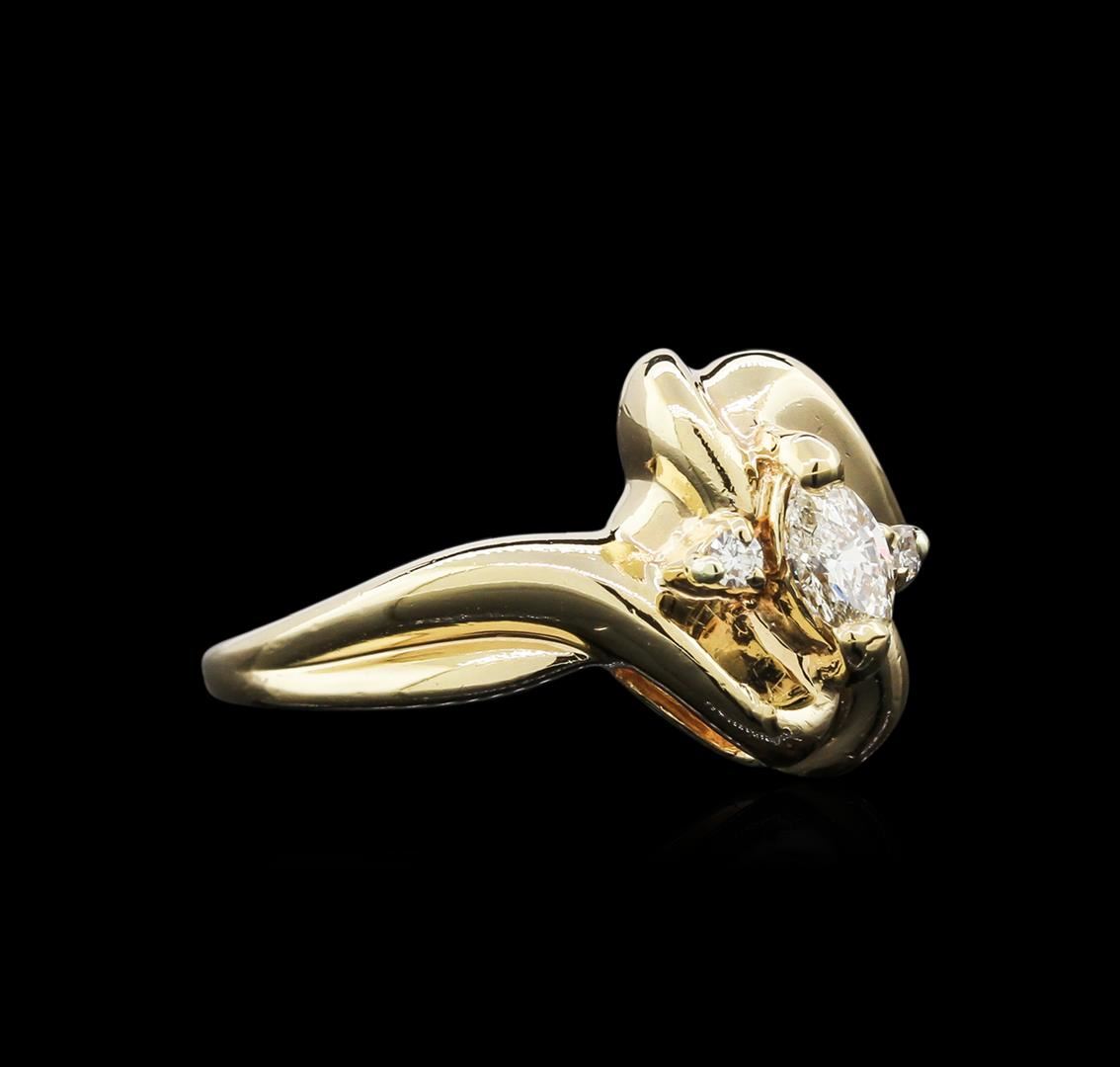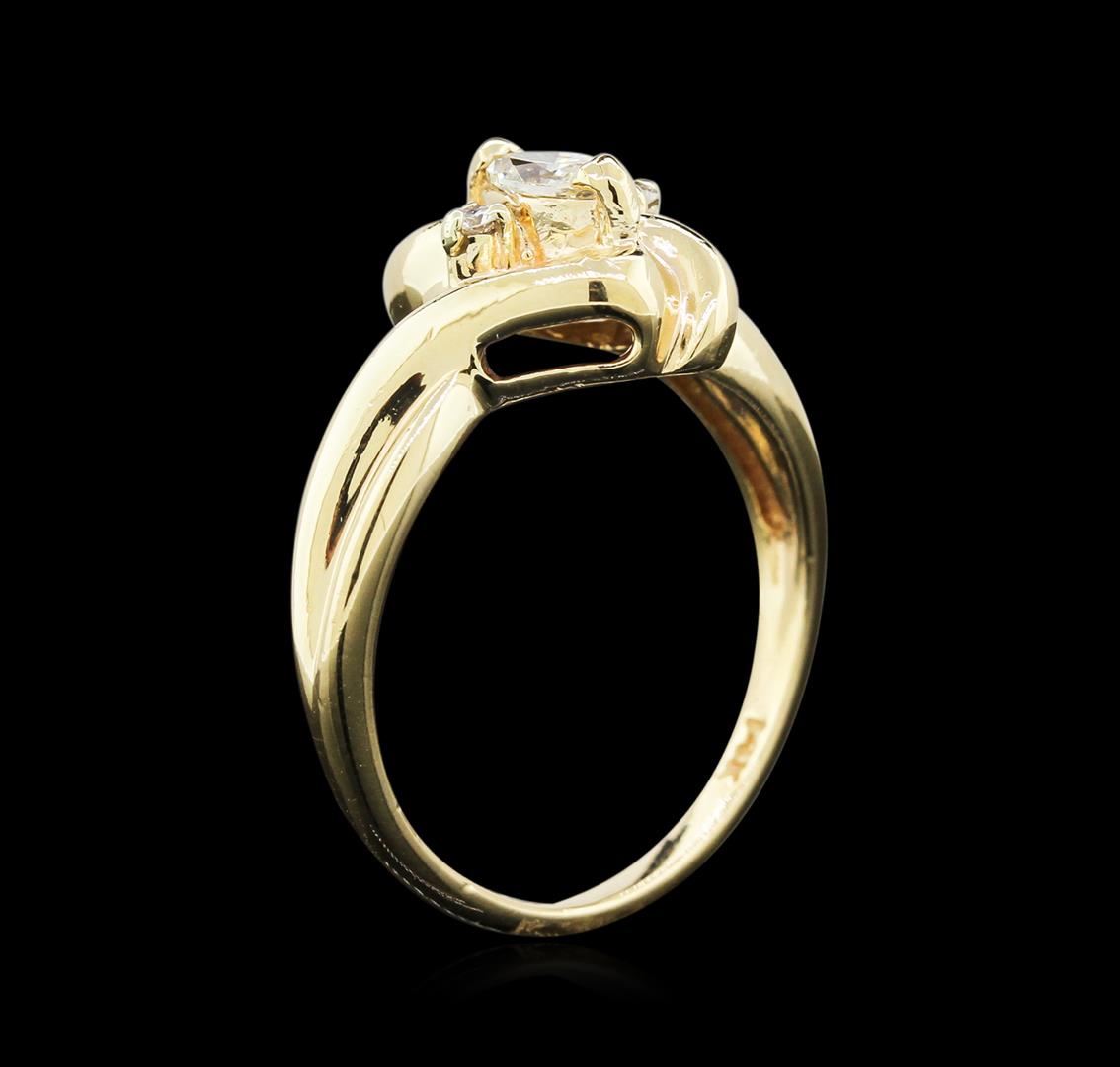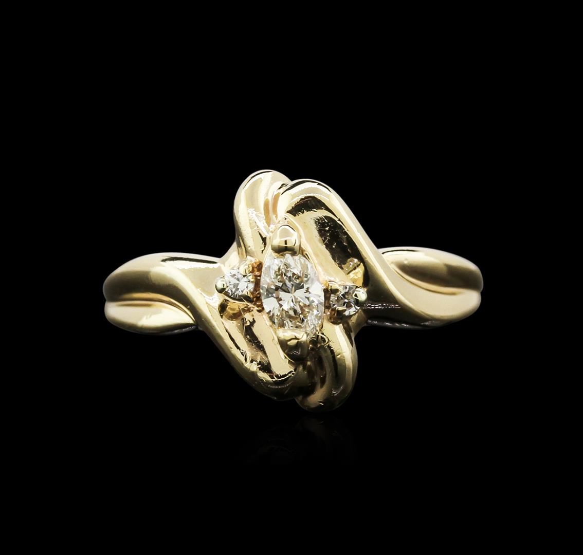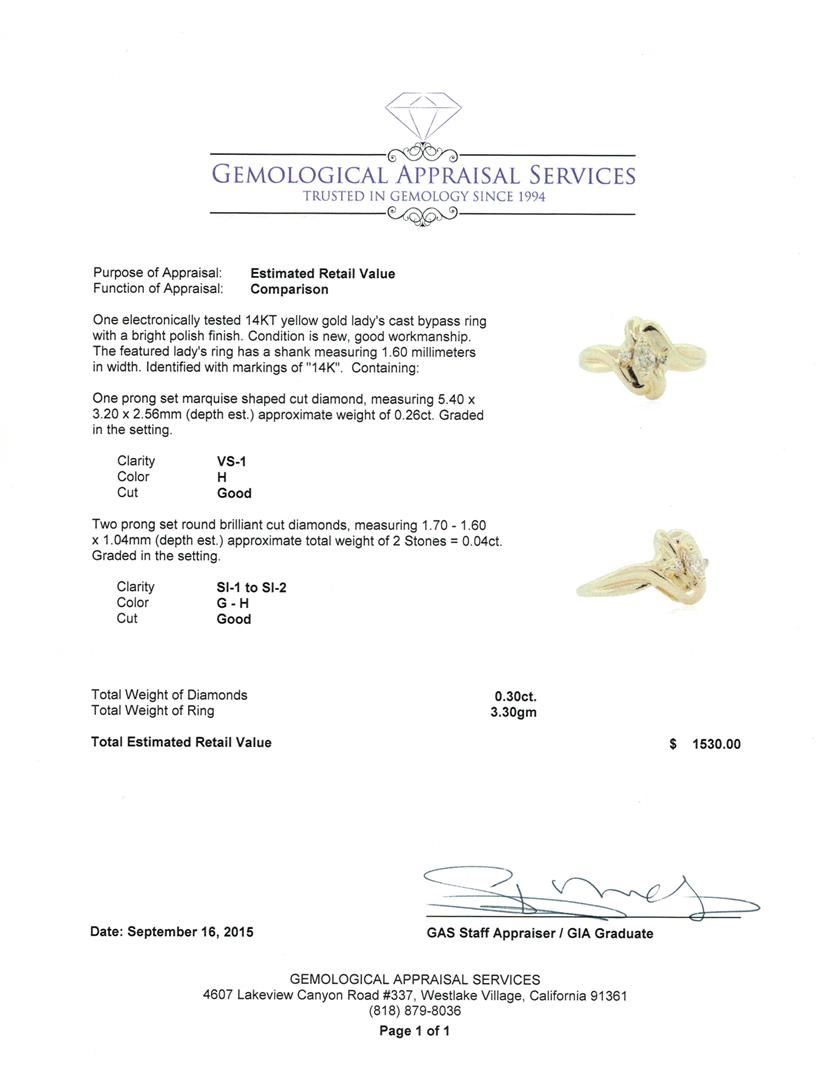One electronically tested 14KT yellow gold lady's cast bypass ring with a bright polish finish. The featured lady's ring has a shank measuring 1.60 millimeters in width. Identified with markings of "14K". Condition is new, good workmanship. Containing: One prong set marquise shaped cut diamond, measuring 5.40 x 3.20 x 2.56mm (depth est.) approximate weight of 0.26ct. Graded in the setting. Clarity: VS-1. Color: Good Two prong set round brilliant cut diamonds, measuring 1.70 - 1.60 x 1.04mm (depth est.) approximate total weight of 2 Stones = 0.04ct. Graded in the setting. Clarity: SI-1 to SI-2. Color: G - Good. Total Weight of Diamonds 0.30ct. Total Weight of Ring 3.30gm. GAS Appraised at $1,530.00.