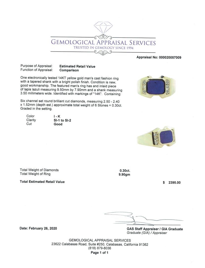 One electronically tested 14KT yellow gold man's cast fashion ring with a tapered shank with a bright polish finish. The featured man's ring has and inlaid piece of lapis lazuli measuring 9.50mm by 7.90mm and a shank measuring 3.50 millimeters wide. Identified with markings of '14K'. Condition is new, good workmanship. Containing: Six channel set round brilliant cut diamonds, measuring 2.50 - 2.40 x 1.52mm (depth est.) approximate total weight of 6 Stones = 0.30ct. Graded in the setting. Color I - K Clarity SI-1 to SI-2 Cut Good. Total Weight of Diamonds 0.30ct.. Total Weight of Ring 9.90gm GAS Appraised at $2395.00. GAS Appraised at $2,710.00.