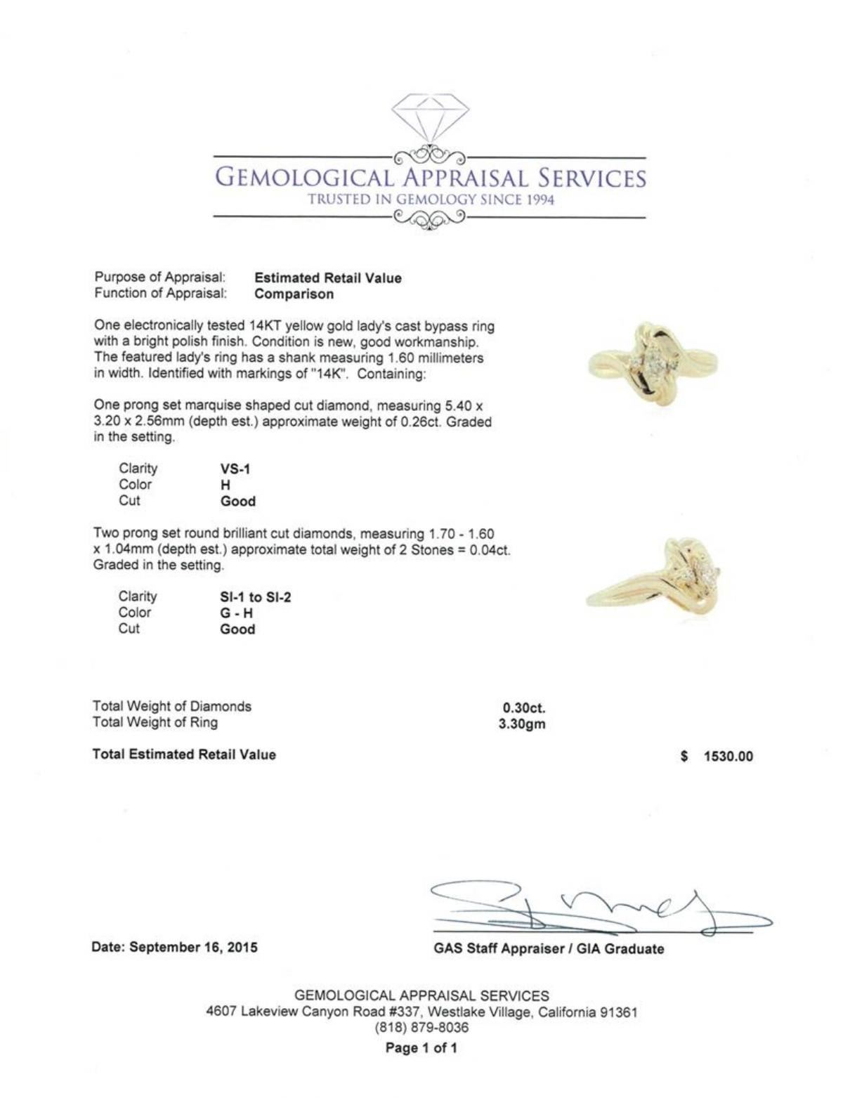 One electronically tested 14KT yellow gold lady's cast bypass ring with a bright polish finish. The featured lady's ring has a shank measuring 1.60 millimeters in width. Identified with markings of "14K". Condition is new, good workmanship. Containing: One prong set marquise shaped cut diamond, measuring 5.40 x 3.20 x 2.56mm (depth est.) approximate weight of 0.26ct. Graded in the setting. Clarity: VS-1. Color: Good Two prong set round brilliant cut diamonds, measuring 1.70 - 1.60 x 1.04mm (depth est.) approximate total weight of 2 Stones = 0.04ct. Graded in the setting. Clarity: SI-1 to SI-2. Color: G - Good. Total Weight of Diamonds 0.30 ct. Total Weight of Ring 3.30gm. GAS Appraised.