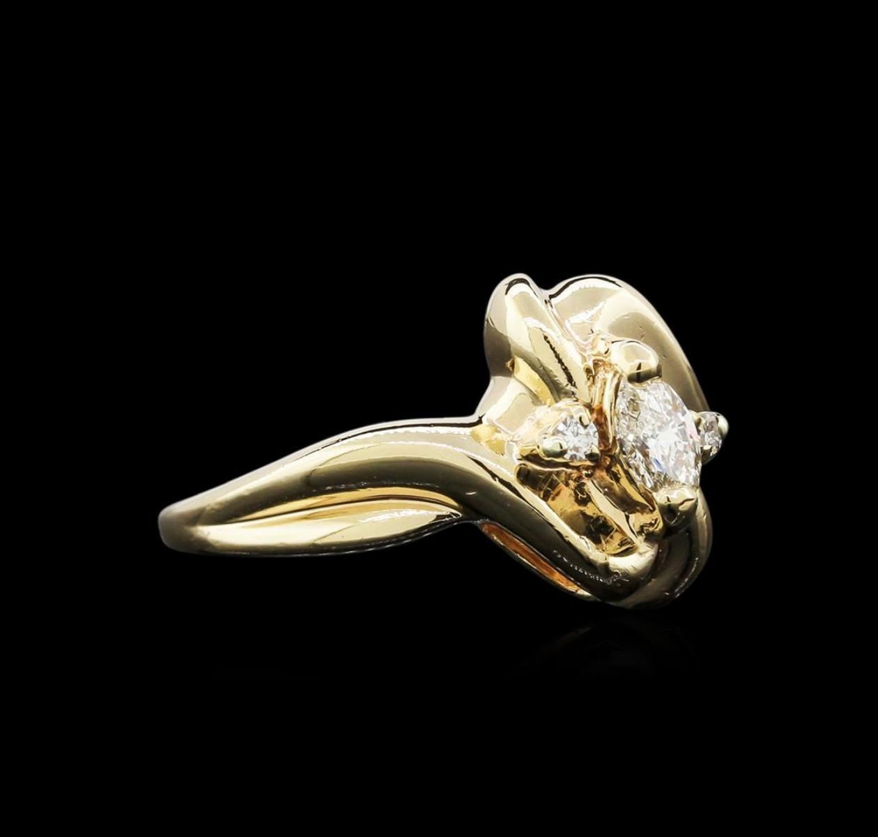 One electronically tested 14KT yellow gold lady's cast bypass ring with a bright polish finish. The featured lady's ring has a shank measuring 1.60 millimeters in width. Identified with markings of "14K". Condition is new, good workmanship. Containing: One prong set marquise shaped cut diamond, measuring 5.40 x 3.20 x 2.56mm (depth est.) approximate weight of 0.26ct. Graded in the setting. Clarity: VS-1. Color: Good Two prong set round brilliant cut diamonds, measuring 1.70 - 1.60 x 1.04mm (depth est.) approximate total weight of 2 Stones = 0.04ct. Graded in the setting. Clarity: SI-1 to SI-2. Color: G - Good. Total Weight of Diamonds 0.30 ct. Total Weight of Ring 3.30gm. GAS Appraised.