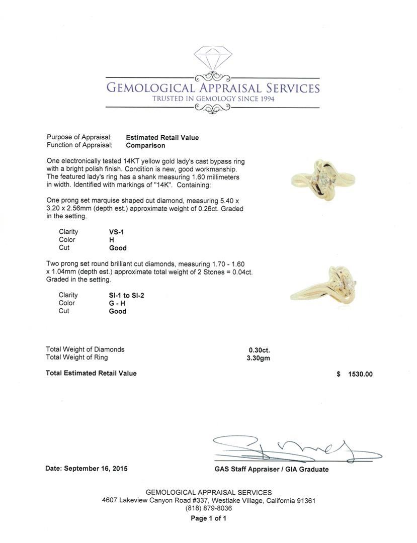 One electronically tested 14KT yellow gold lady's cast bypass ring with a bright polish finish. The featured lady's ring has a shank measuring 1.60 millimeters in width. Identified with markings of "14K". Condition is new, good workmanship. Containing: One prong set marquise shaped cut diamond, measuring 5.40 x 3.20 x 2.56mm (depth est.) approximate weight of 0.26ct. Graded in the setting. Clarity: VS-1. Color: Good Two prong set round brilliant cut diamonds, measuring 1.70 - 1.60 x 1.04mm (depth est.) approximate total weight of 2 Stones = 0.04ct. Graded in the setting. Clarity: SI-1 to SI-2. Color: G - Good. Total Weight of Diamonds 0.30 ct. Total Weight of Ring 3.30gm. GAS Appraised.