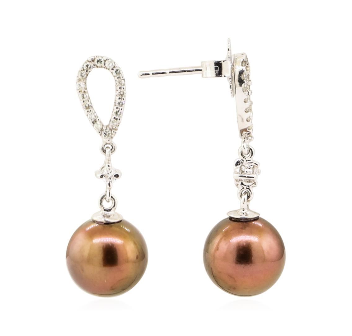 One pair of dangle earrings with a drop of 28 millimeters featuring: 14KT white gold weighing 4.2 grams containing diamonds weighing 0.30 ctw and two chocolate pearls measuring 9.5 millimeters in diameter.