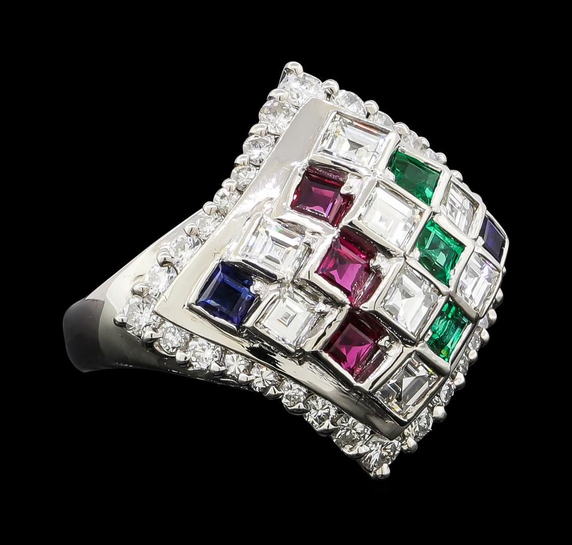 One ring featuring: Platinum containing Emerald with a total weight of 0.30ct, Ruby with a total weight of 0.36ct, and Diamonds with a total weight of 1.87ct. Total Weight of Ring: 12.9 grams.
