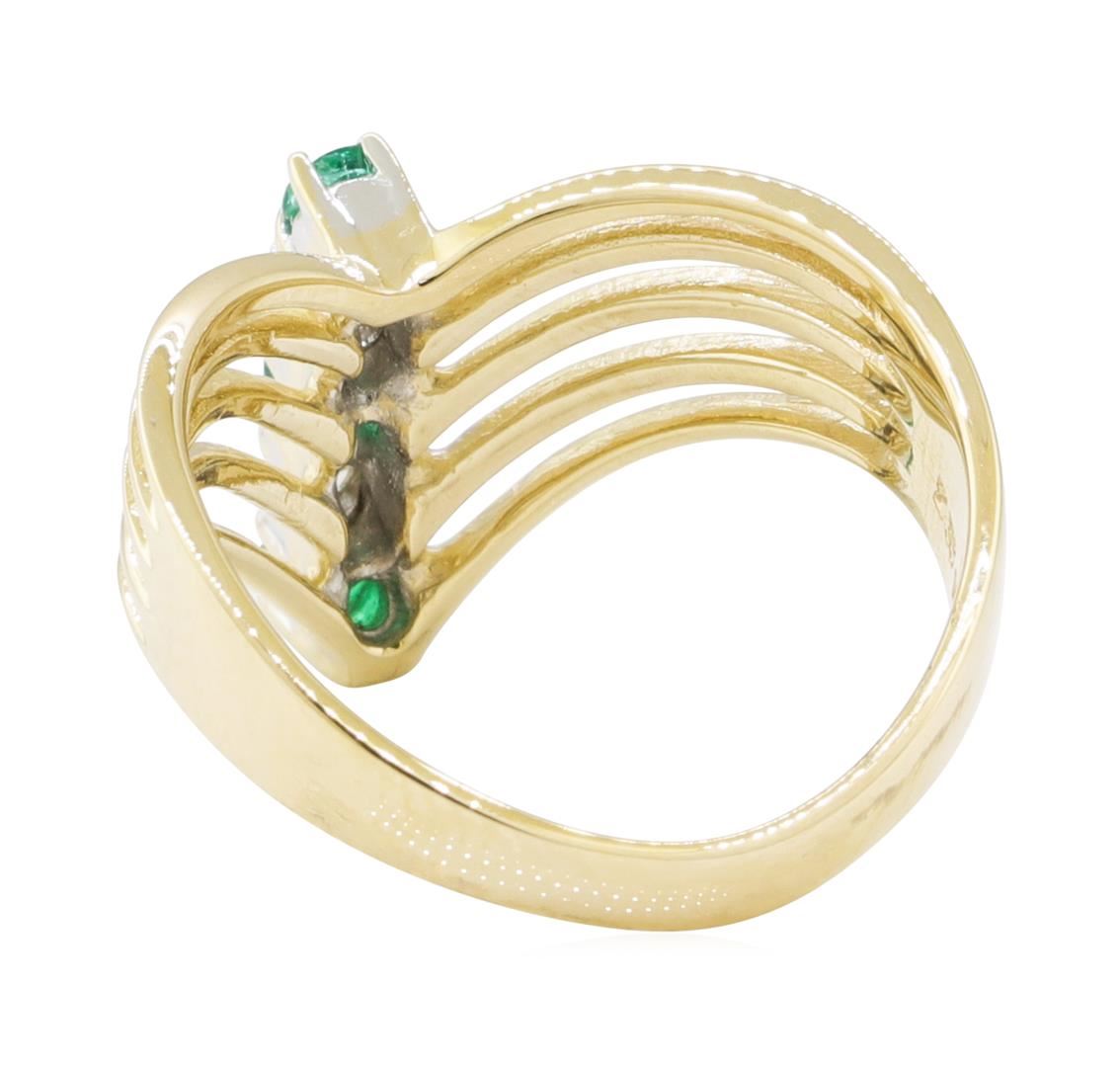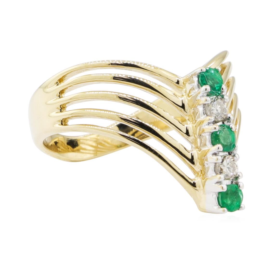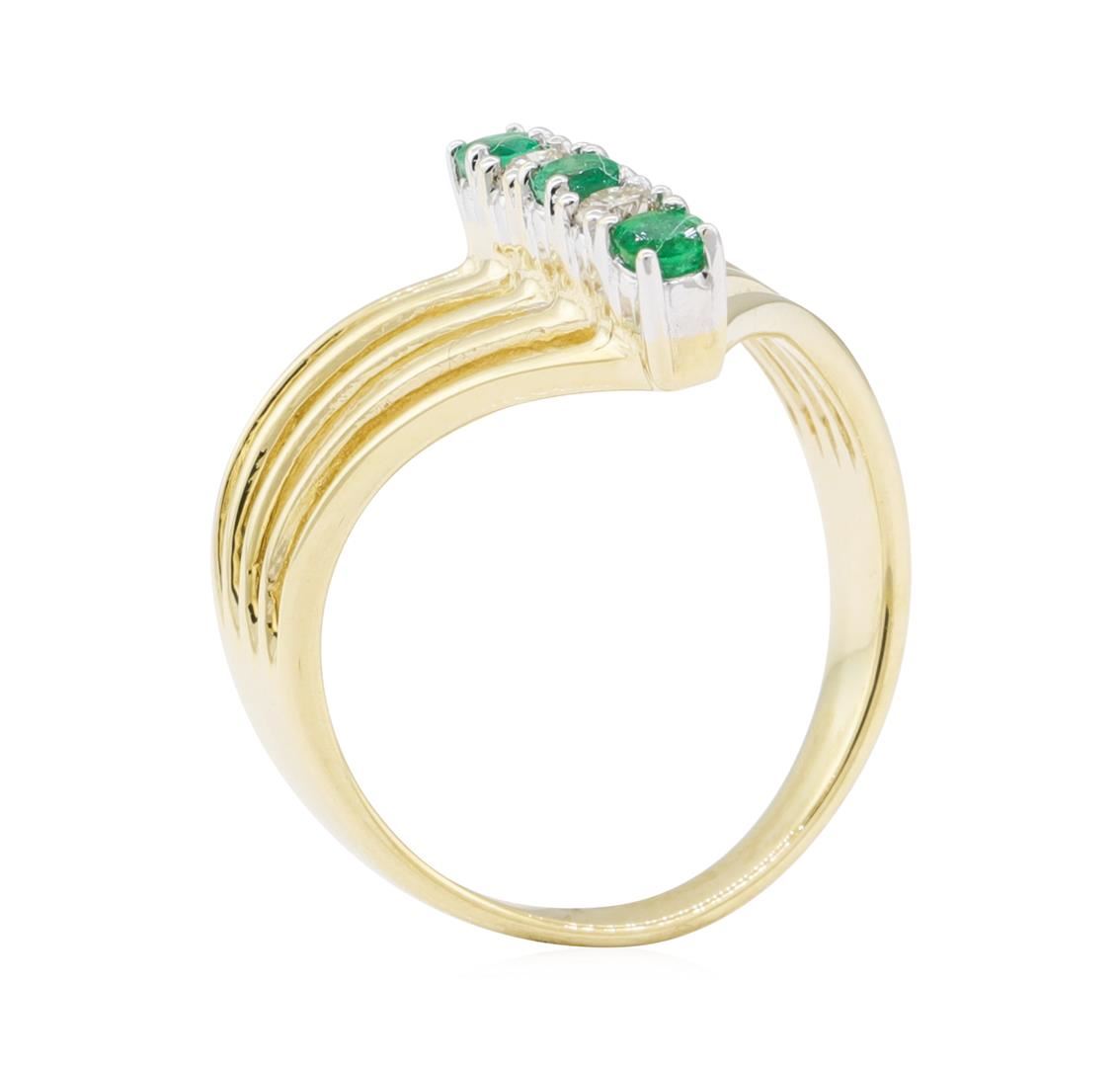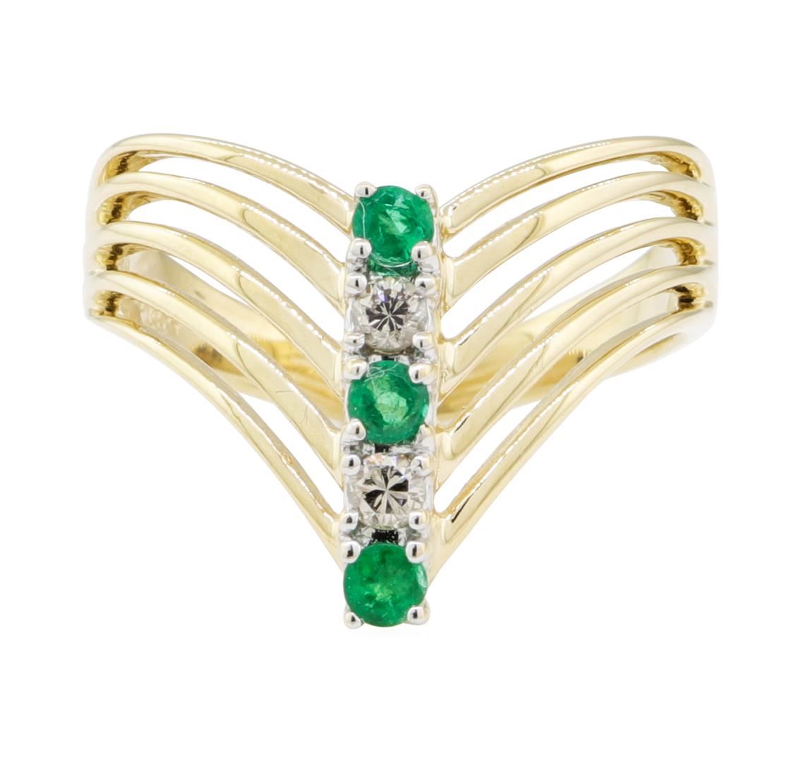 One ring featuring: 14KT yellow gold weighing 3.9 grams containing three round emeralds weighing 0.22ctw and diamonds weighing 0.08ctw.