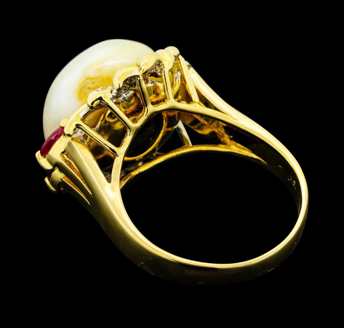 One ruby, pearl and diamond ring featuring: 18KT yellow gold weighing 13.14 grams containing one center pearl, rubies weighing 0.30ctw and diamonds weighing 0.05ctw.