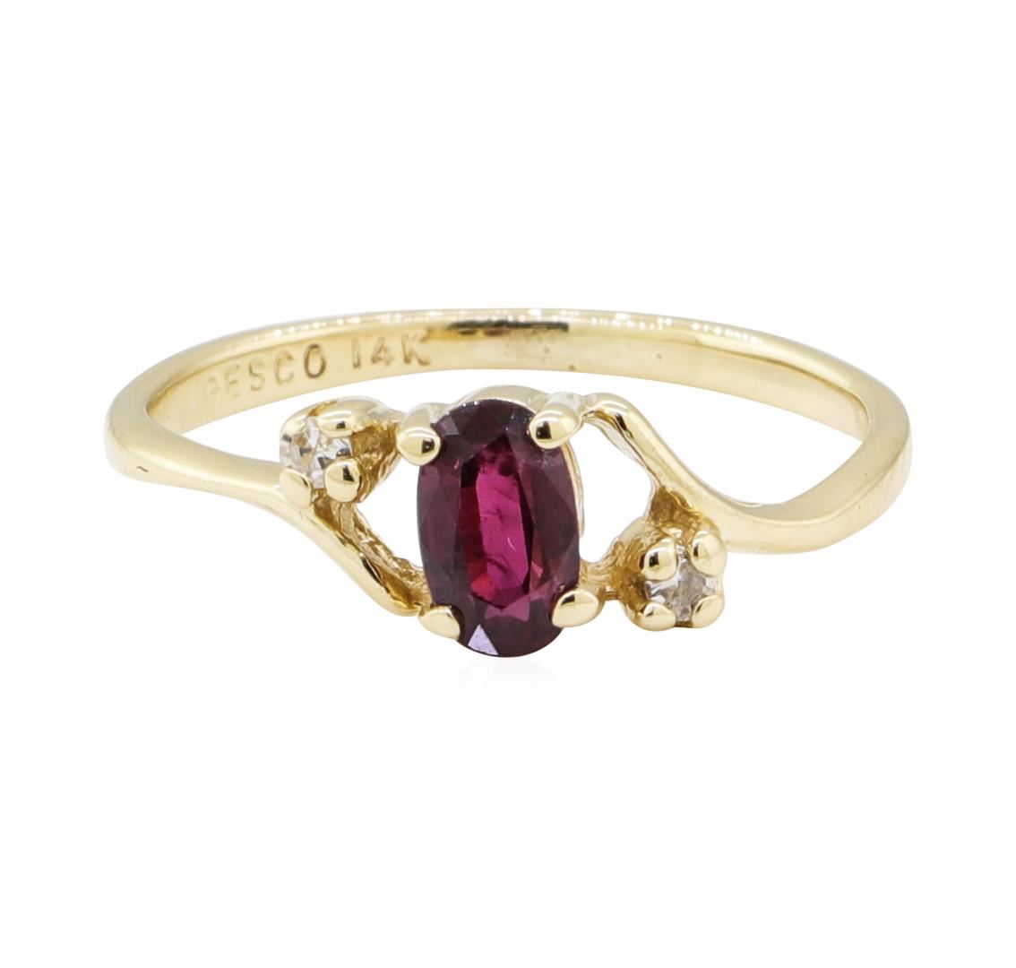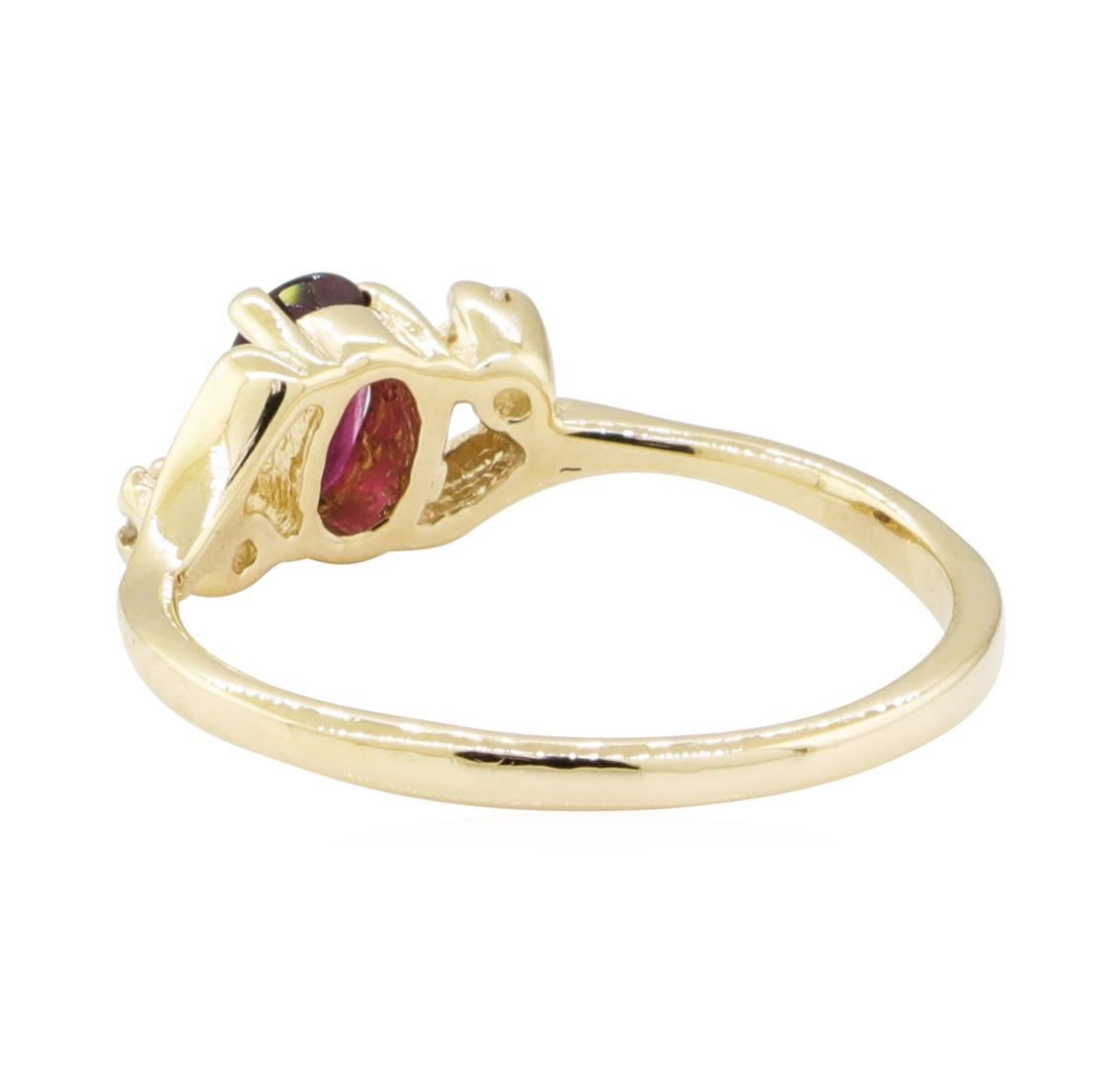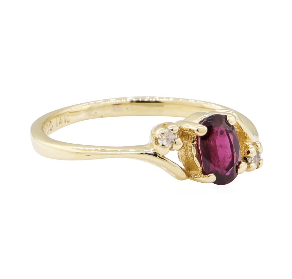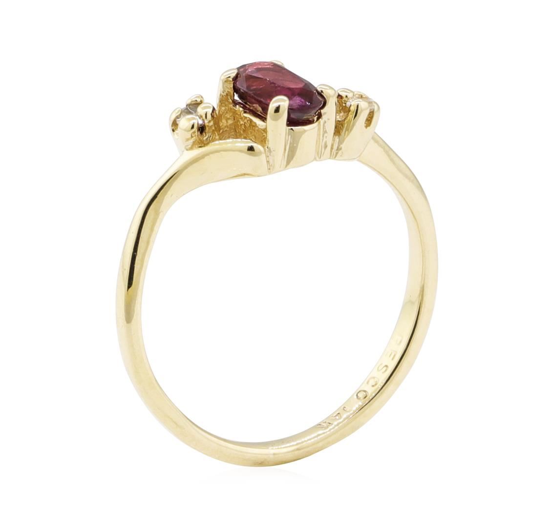 One ring with a bypass motif featuring: 14KT yellow gold weighing 1.6 grams containing one ruby weighing 0.28ct and diamonds weighing 0.02ctw.