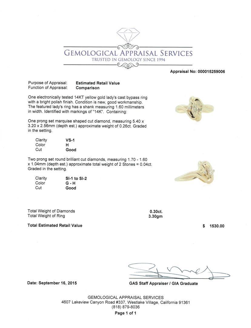 One electronically tested 14KT yellow gold lady's cast bypass ring with a bright polish finish. The featured lady's ring has a shank measuring 1.60 millimeters in width. Identified with markings of "14K". Condition is new, good workmanship. Containing: One prong set marquise shaped cut diamond, measuring 5.40 x 3.20 x 2.56mm (depth est.) approximate weight of 0.26ct. Graded in the setting. Clarity: VS-1. Color: Good Two prong set round brilliant cut diamonds, measuring 1.70 - 1.60 x 1.04mm (depth est.) approximate total weight of 2 Stones = 0.04ct. Graded in the setting. Clarity: SI-1 to SI-2. Color: G - Good. Total Weight of Diamonds 0.30ct. Total Weight of Ring 3.30gm. GAS Appraised at $1,530.00.