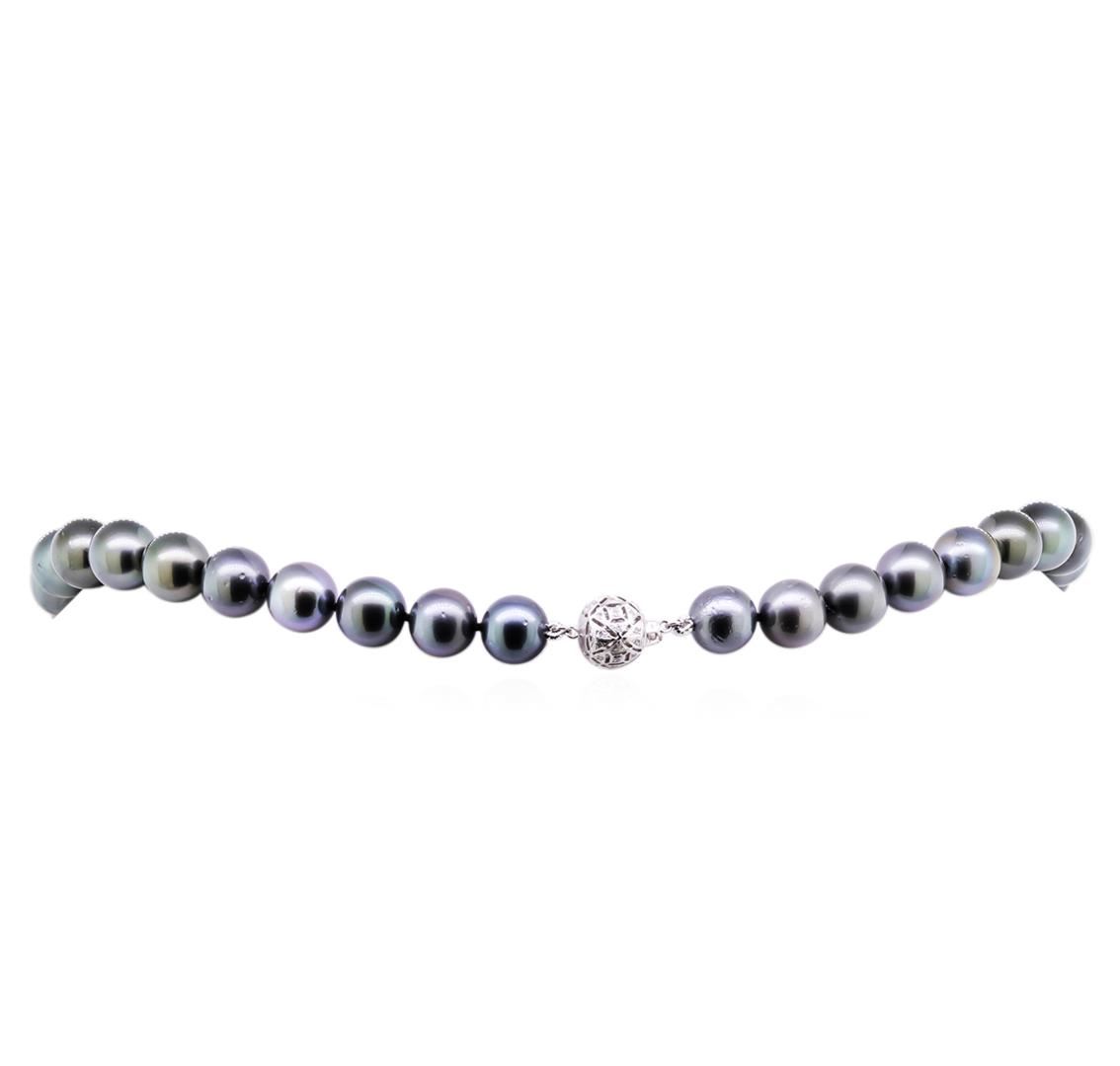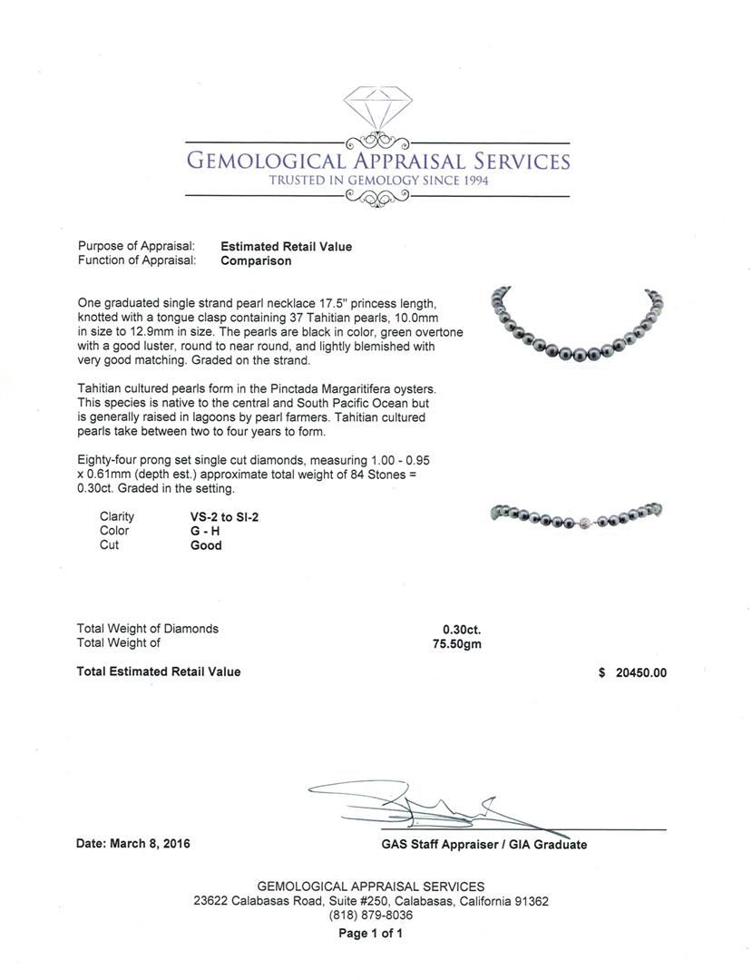 One graduated single strand pearl necklace 17.5" princess length, knotted with a tongue clasp containing 37 Tahitian pearls, 10.0mm in size to 12.9mm in size. The pearls are black in color, green overtone with a good luster, round to near round, and lightly blemished with very good matching. Graded on the strand. Tahitian cultured pearls form in the Pinctada Margaritifera oysters. This species is native to the central and South Pacific Ocean but is generally raised in lagoons by pearl farmers. Tahitian cultured pearls take between two to four years to form. Eighty-Four prong set single cut diamonds, measuring 1.00 - 0.95 x 0.61mm (depth est.) approximate total weight of 84 Stones = 0.30ct. Graded in the setting. Clarity: VS-2 to SI-2. Color: G - Good. Total Weight of Diamonds 0.30ct. Total Weight of 75.50gm. GAS Appraised at $20,450.00.