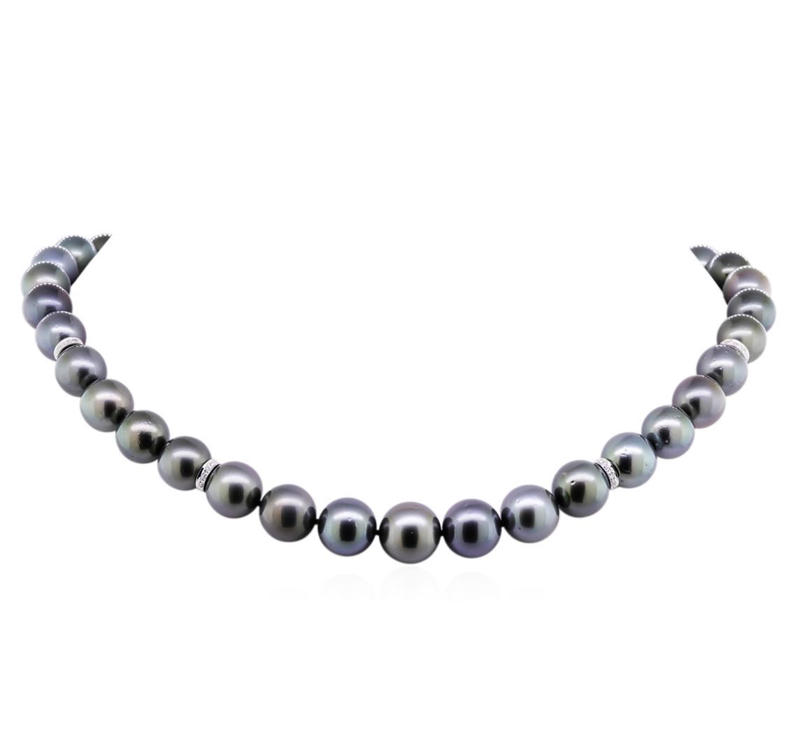 One graduated single strand pearl necklace 17.5" princess length, knotted with a tongue clasp containing 37 Tahitian pearls, 10.0mm in size to 12.9mm in size. The pearls are black in color, green overtone with a good luster, round to near round, and lightly blemished with very good matching. Graded on the strand. Tahitian cultured pearls form in the Pinctada Margaritifera oysters. This species is native to the central and South Pacific Ocean but is generally raised in lagoons by pearl farmers. Tahitian cultured pearls take between two to four years to form. Eighty-Four prong set single cut diamonds, measuring 1.00 - 0.95 x 0.61mm (depth est.) approximate total weight of 84 Stones = 0.30ct. Graded in the setting. Clarity: VS-2 to SI-2. Color: G - Good. Total Weight of Diamonds 0.30ct. Total Weight of 75.50gm. GAS Appraised at $20,450.00.