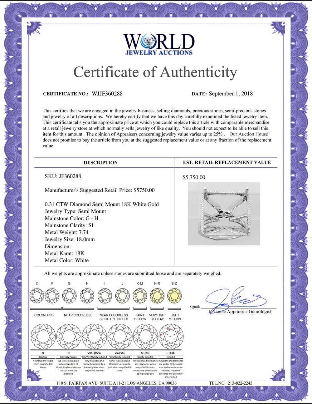 WORLD JEWELRY AUCTION believes to the best of its knowledge that the information presented in any listing has come from reliable sources. Such information is presented solely for the convenience of the Purchaser. WJA makes no warranties of any kind related to the information presented in any listing. WJA further makes no warranties, either express or implied, relating to the value, marketability or condition of the lot described in any listing. Prospective bidders should investigate a lot thoroughly before bidding. By bidding the Bidder acknowledges that Bidder has investigated the lot to his or her satisfaction, or, that Bidder has chosen not to do so, and agrees to accept the lot being bid on with no objections after the sale closes. If you are uncertain please contact us with your questions prior to bidding. If you are still uncertain after we reply, please refrain from bidding. Photos other graphic material contained in any listing of generic or duplicate lots may be stock presentations and not necessarily of the specific lot.