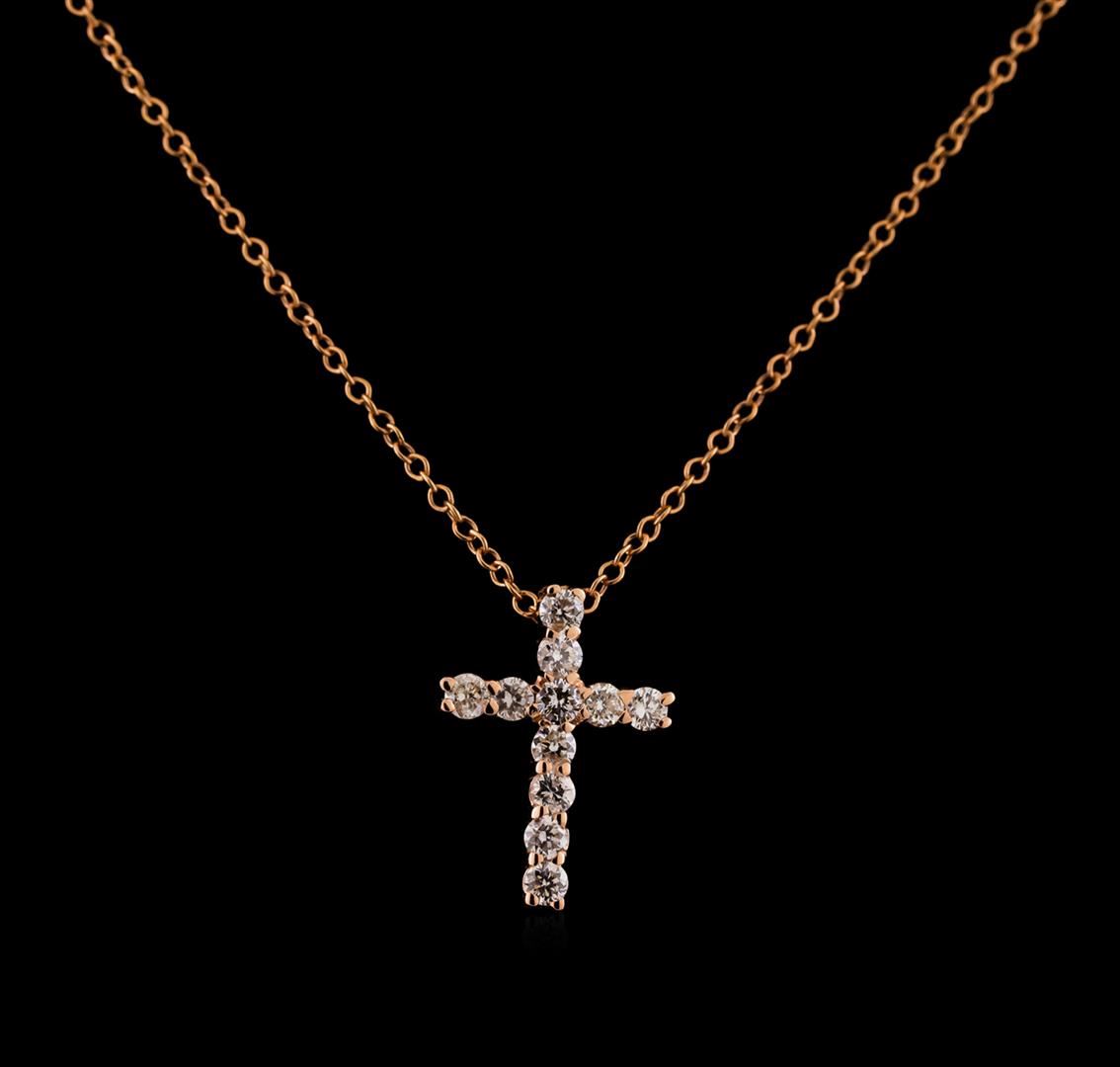 One cross pendant with chain featuring: 14KT rose gold weighing 1.92 grams containing diamonds weighing 0.31ctw.