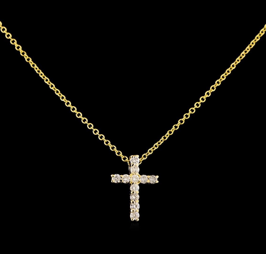 One cross pendant with chain featuring: 14KT yellow gold weighing 2.64 grams containing diamonds with a total weight of 0.31ct.