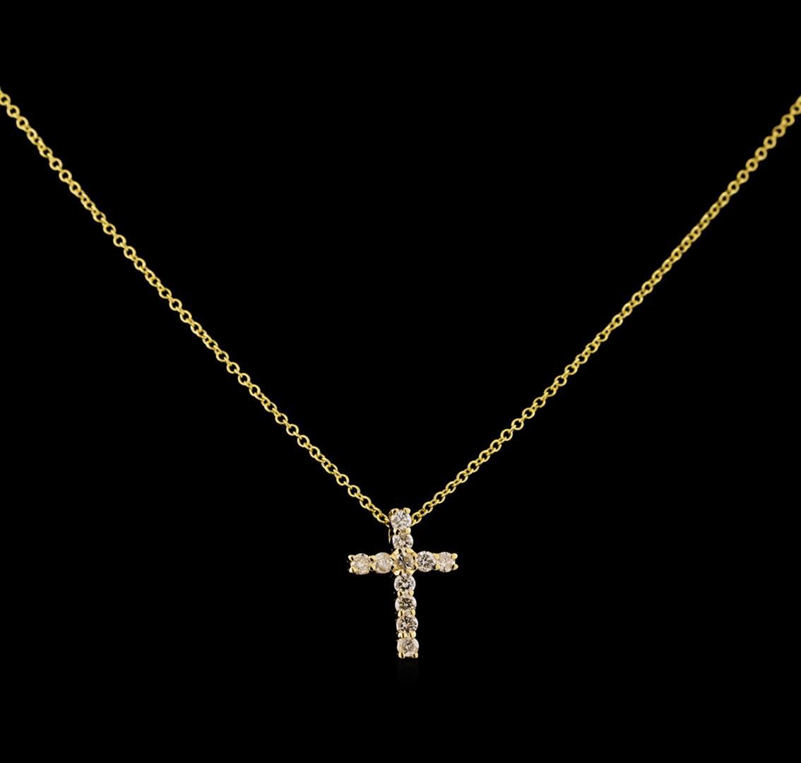 One cross pendant with chain featuring: 14KT yellow gold weighing 1.78 grams containing diamonds weighing 0.31ctw.
