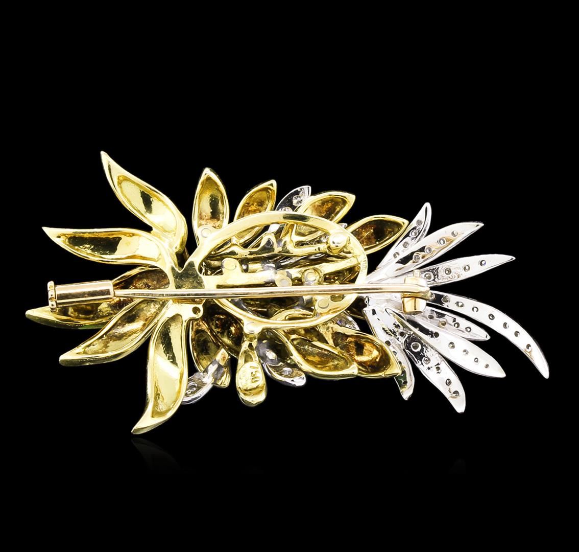 One electronically tested 18KT white and yellow gold lady's combination cast & assembled fashion vintage pin with a bright polish with milgrain detailing finish. The featured pin has a floral motif with green to yellowish green enameled leafs. Identified with markings of "750". Condition is used, good workmanship. Containing: Fifty-Two bead set single cut diamonds, measuring 1.30 - 1.05 x 0.71mm (depth est.) approximate. Total Weight of 52 Stones = 0.31ct. Graded in the setting. Clarity: VS-2 to SI-1. Color: G - Very Good. Total Weight of Diamonds 0.31ct. Total Weight of Vintage Pin 17.70gm. GAS Appraised.